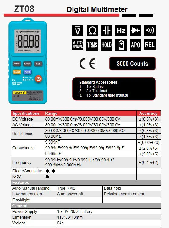 Цифровой мультиметр ZOYI ZT08, мультиметр True-RMS, 8000 отсчетов, Вольтметр постоянного и переменного тока, Омметр, измеритель напряжения, частоты светодиодный светильник кой