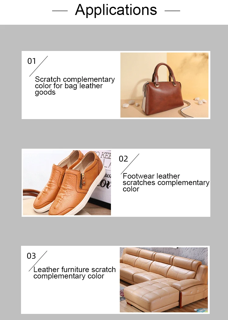 Применение1. Скрепляющий цвет для кожаных сумок.2. Обувь из кожи, царапины, дополнительный цвет.3. Кожаная мебель царапает дополнительный цвет.