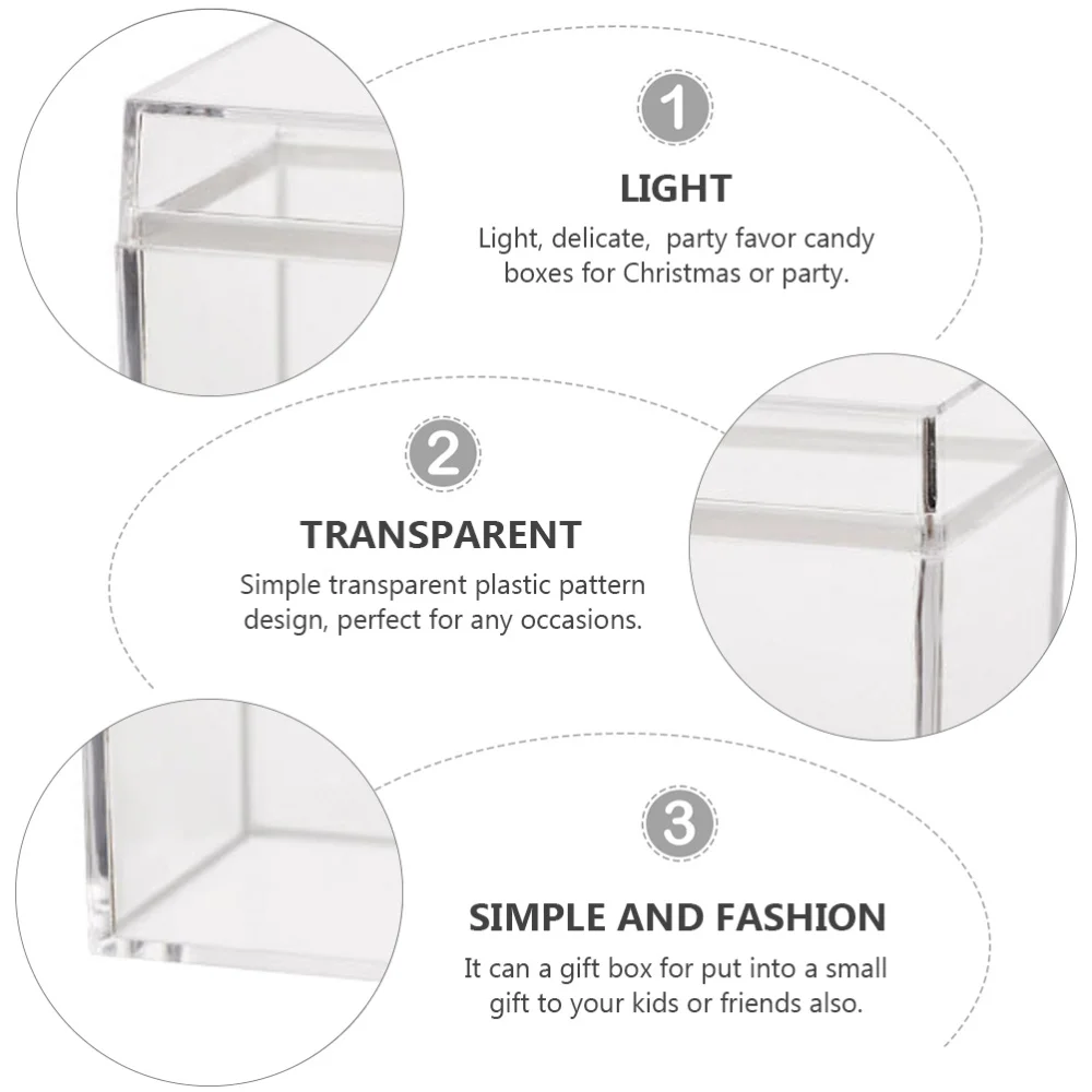 Это набор прозрачных квадратных коробок. Изготовлено из высококачественного материала, достаточно безопасно и практично. Подарочные коробки могут помочь вам держать ваши маленькие подарки, такие как конфеты, печенье и т. Д. С квадратной формы, вам не нужно беспокоиться о том, что ваши подарки будут повреждены.