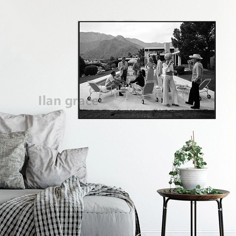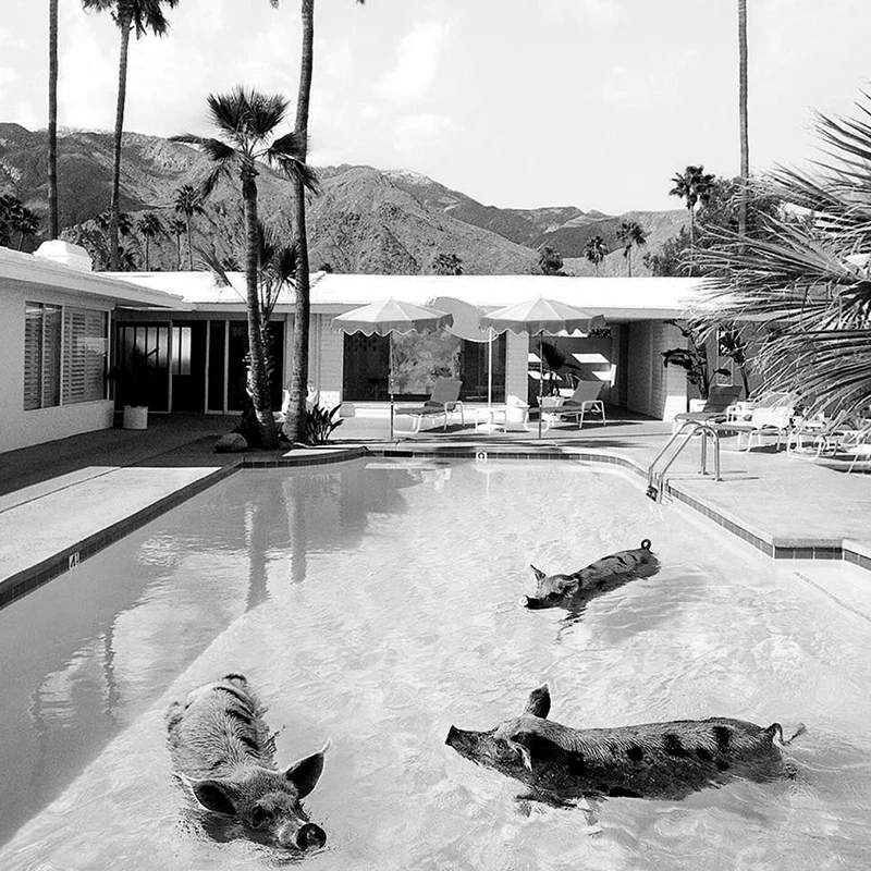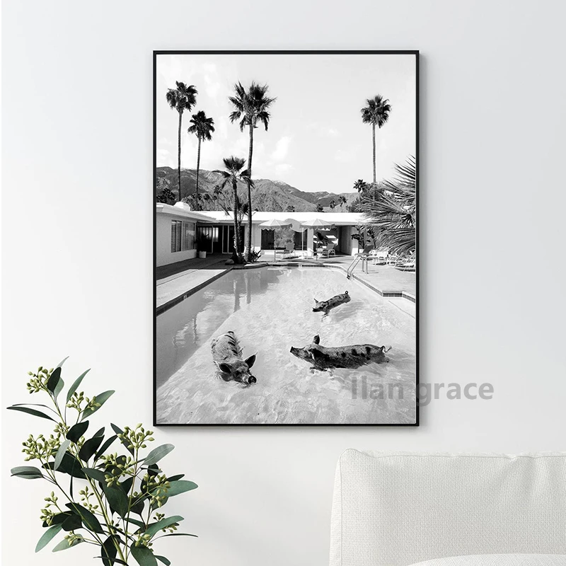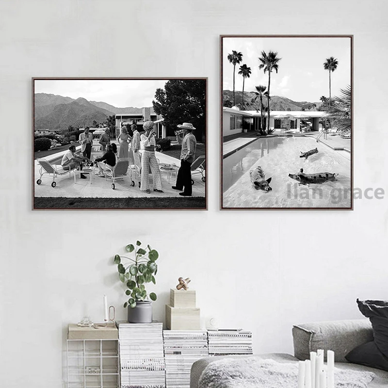 Плакат с изображением свиней в бассейне, пальмовые пружины, черно-белая фотография, Середина века, винтажные настенные картины, холст, живопись, домашний декор