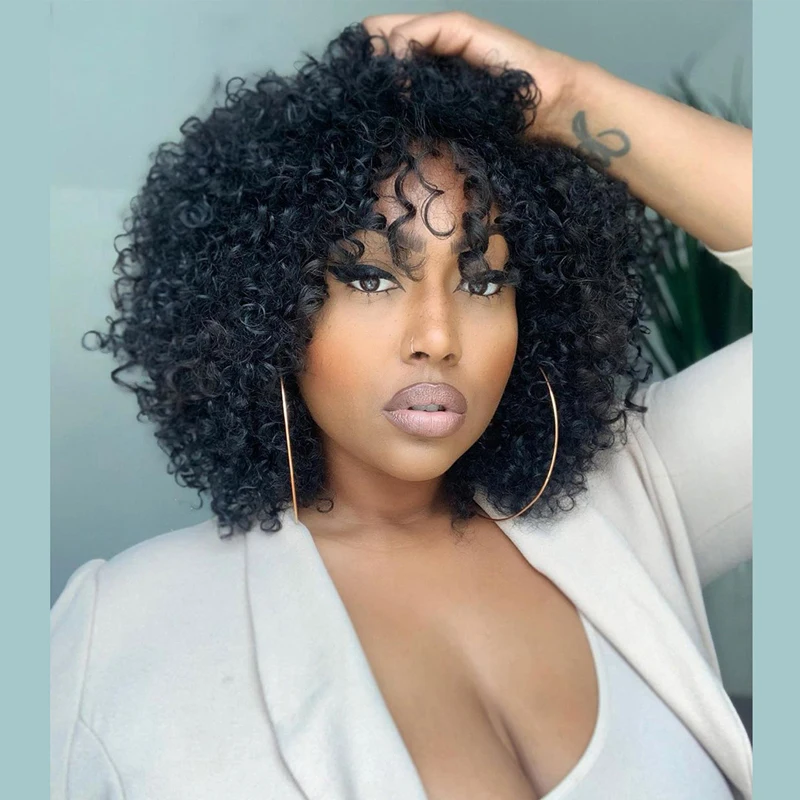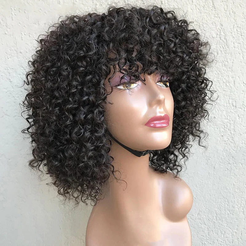 Афро кудрявые вьющиеся человеческие волосы парики для чернокожих женщин предварительно выщипанные полные машинные бразильские волосы Remy без шнуровки передний парик с челкой