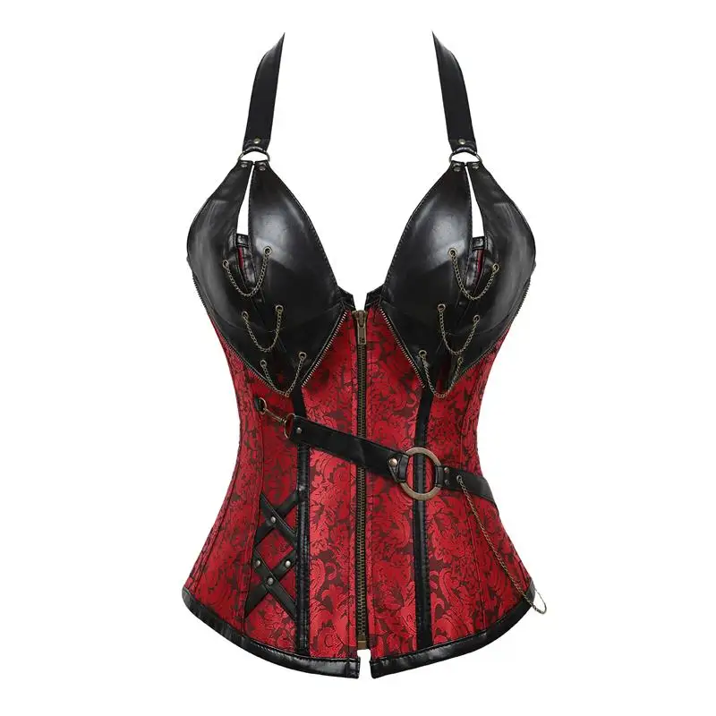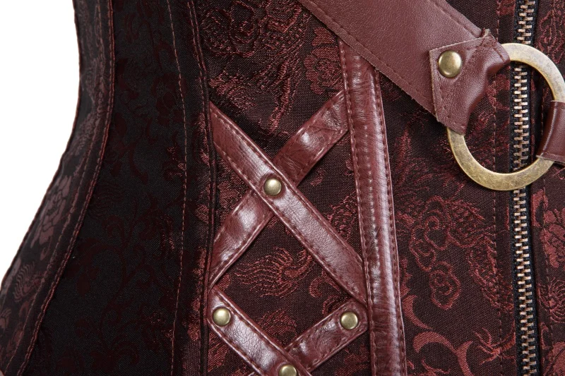 4-Сталь хип-хоп панк кожа корсет с поясом и круглым вырезом Shapepiece комплект нижнего белья, чайный сервиз Европейский суд одежда коричневого цвета