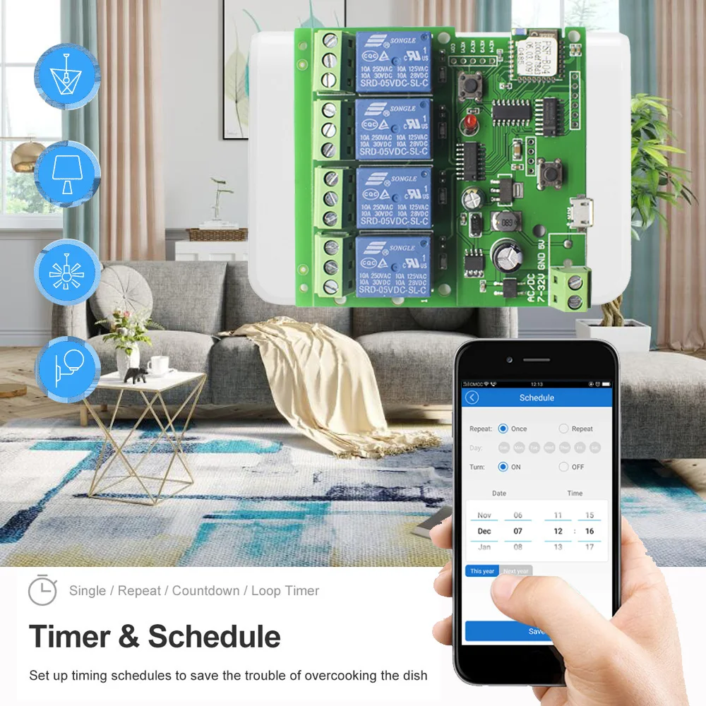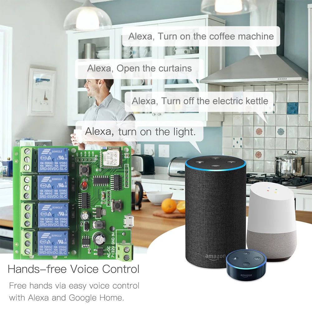 Совместим с любой бытовой техникой (DC7-32V переменный ток 85-250 В, максимальный ток 10 А, максимальная мощность 2200 Вт). Небольшой модуль имеет возможность самостоятельно использовать для пользователей с базовыми знаниями электрика