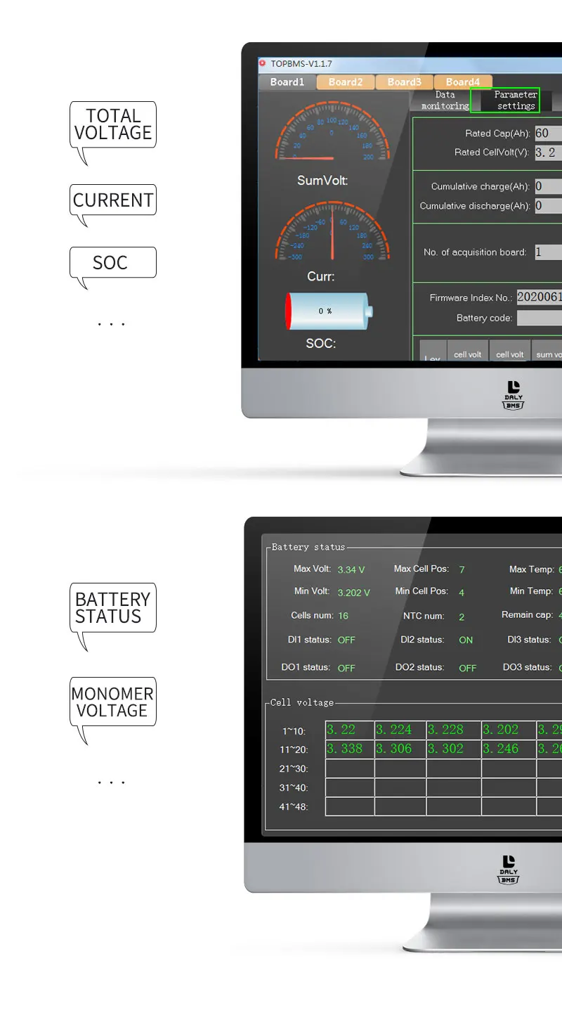 18650 smart BMS 16S 60V 150A 200A 250A Bluetooth 485 к USB устройству CAN NTC UART программное обеспечение Li-on Battery protection Board BMS◆ В настоящее время все умные BMS без водонепроницаемой функции.◆ Эта ссылка предназначена для литий-ионного аккумулятора 16S 60V. Пожалуйста, заполните параметр после размещения заказа, чтобы обеспечить SOC правильной информацией.По крайней мере, ответ должен быть отправлен нам Aliexpress центром сообщений. Спасибо.Особенности◆ UART: это обычный продукт Daly. UART является универсальным асинхронным приемником/передатчиком, он трансформирует данные для передачи между последовательной связью и параллельной связью. Как чип для преобразования параллельных входных сигналов в серийные Выходные сигналы, UART обычно интегрируется в другие коммуникационные интерфейсы.◆ RS485: Пожалуйста, выберите модель RS485 Daly. RS-485 принимает сбалансированную передачу и дифференциальный прием, поэтому он имеет способность подавлять помехи в обычном режиме.◆ Модуль Bluetooth: если вам нужна эта функция, пожалуйста, выберите модуль bluetooth, если вы не покупаете его, мы не отправим его вам.◆ Ниже аксессуары нужно купить отдельно.1.USB к UART кабель 2.USB к RS485 кабель 3. Модуль Bluetooth 4. Панель дисплея питания (активация ключа) 5.BMS сенсорный экран управления1. DL16S 60V Smart BMS 150A 200A 250A bms можно использовать для 16S Li ion или LiFePO4 или аккумулятор лто. Клиент может отрегулировать paramter перезарядки или переразряда параметр сидя и другие параметры, если клиенту нужно использовать какой тип батареи для той же серии батареи.Внимание:Клиент должен определить серии батарей, затем выбрать ту же серию BMS. Например, ваш аккумулятор 24S, вы должны выбрать 24S BMS, не можете выбрать 20 или другой. Номер серии BMS фиксирован, не регулируется после отправки BMS.◆ Инструкции по управлению: контроль устройства дистанционного управления.◆Значок транспортного средства: передача данных отправка команды◆Статистический отчет: собирайте информацию о данных, клиент может контролировать емкость аккумулятора и другую информацию о тревоге.◆Электронный забор: Предельный Диапазон забор.◆Информация об устройстве: информация о параметрах устройства и т. д.Информацию о вашем аккумуляторе можно проверить на вашем хост-компьютере, затем вы можете контролировать состояние батареи в любое время. Который легко контролирует ваше устройство. Умные BMS делают нашу жизнь легкой.