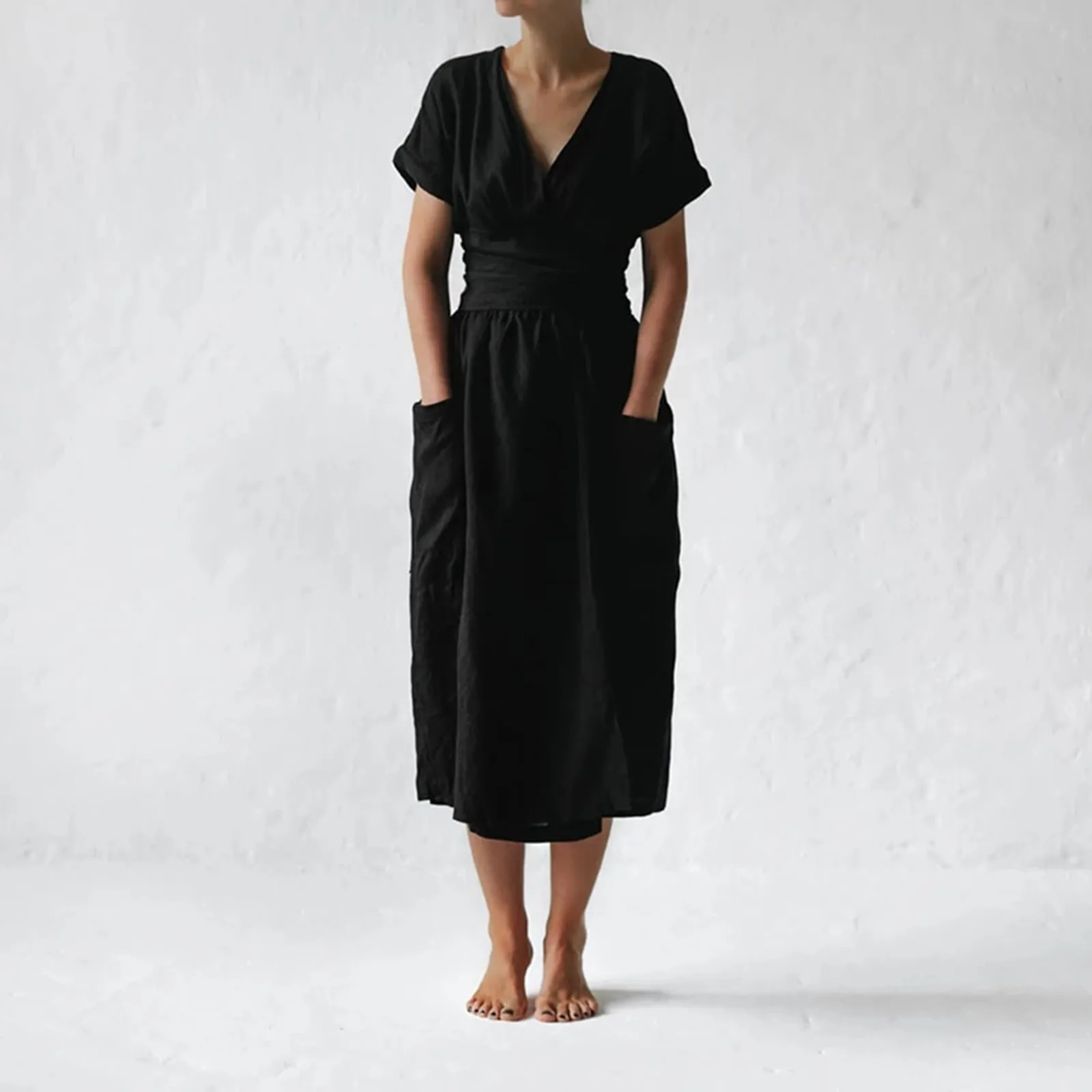 Женское повседневное однотонное платье с v-образным вырезом и коротким рукавом, платье на бретелях с карманами и разрезом