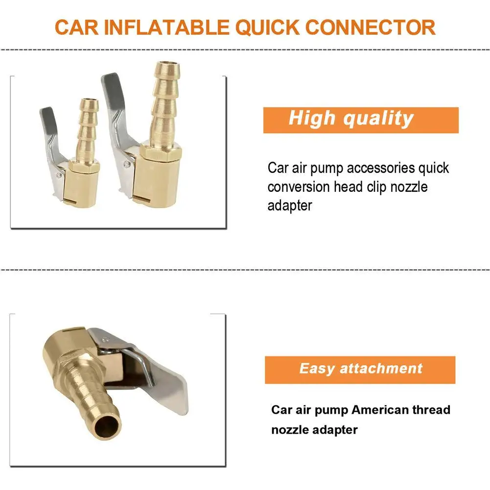 Аксессуары для автомобильного воздушного насоса, адаптер с быстрой конверсионной головкой сопло с зажимомОсобенности:Легкое крепление и снятие.Надувной патрон US-mouth.Высокое качество, прочность.Спецификация:Материалы: латунь.Тип: американский.Внутренний диаметр: 6 мм/8 мм.Посылка входит: