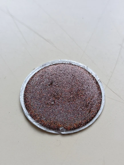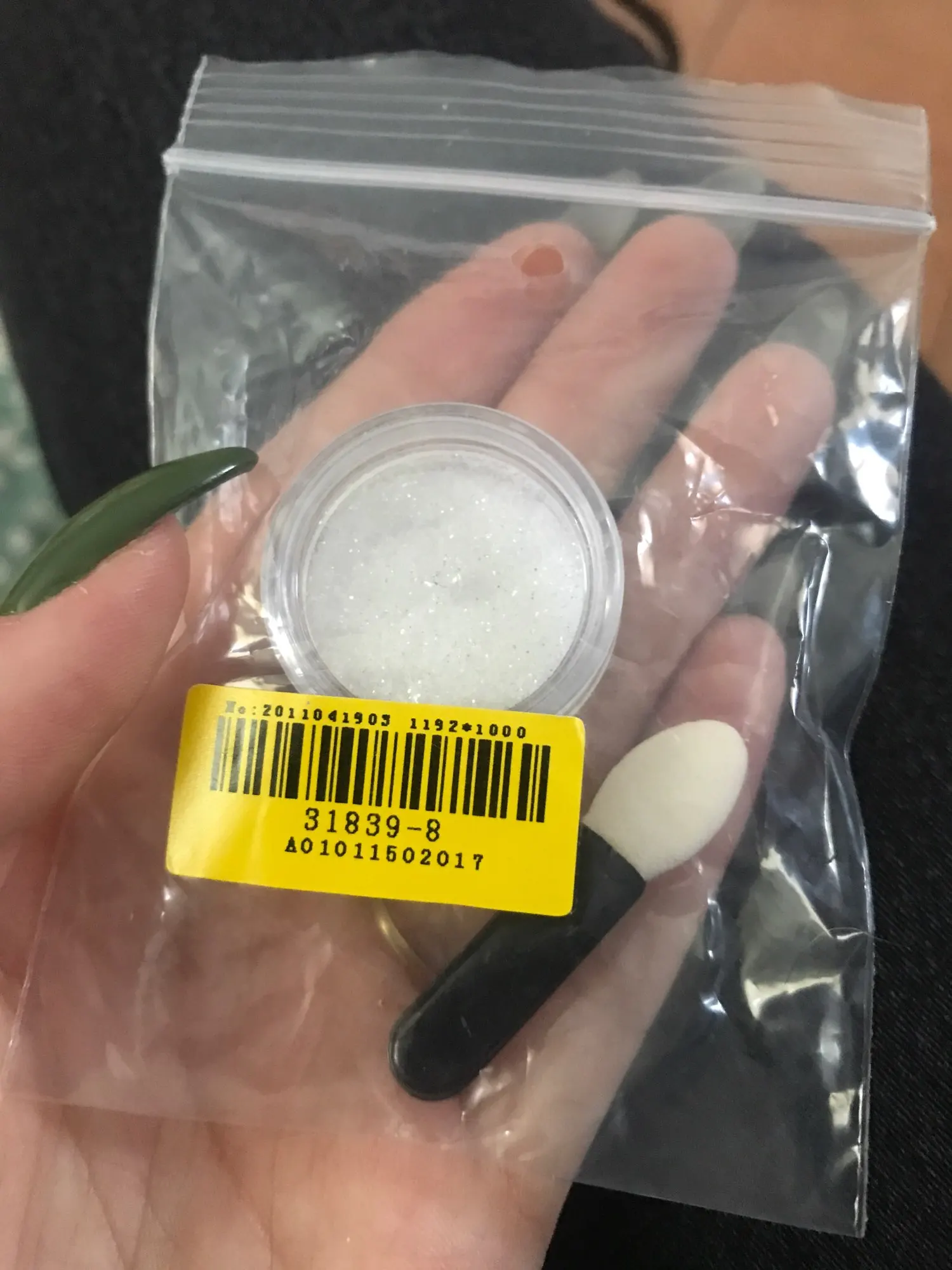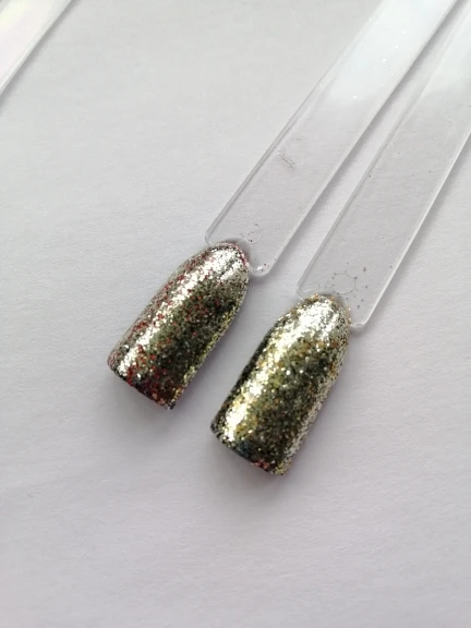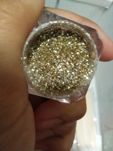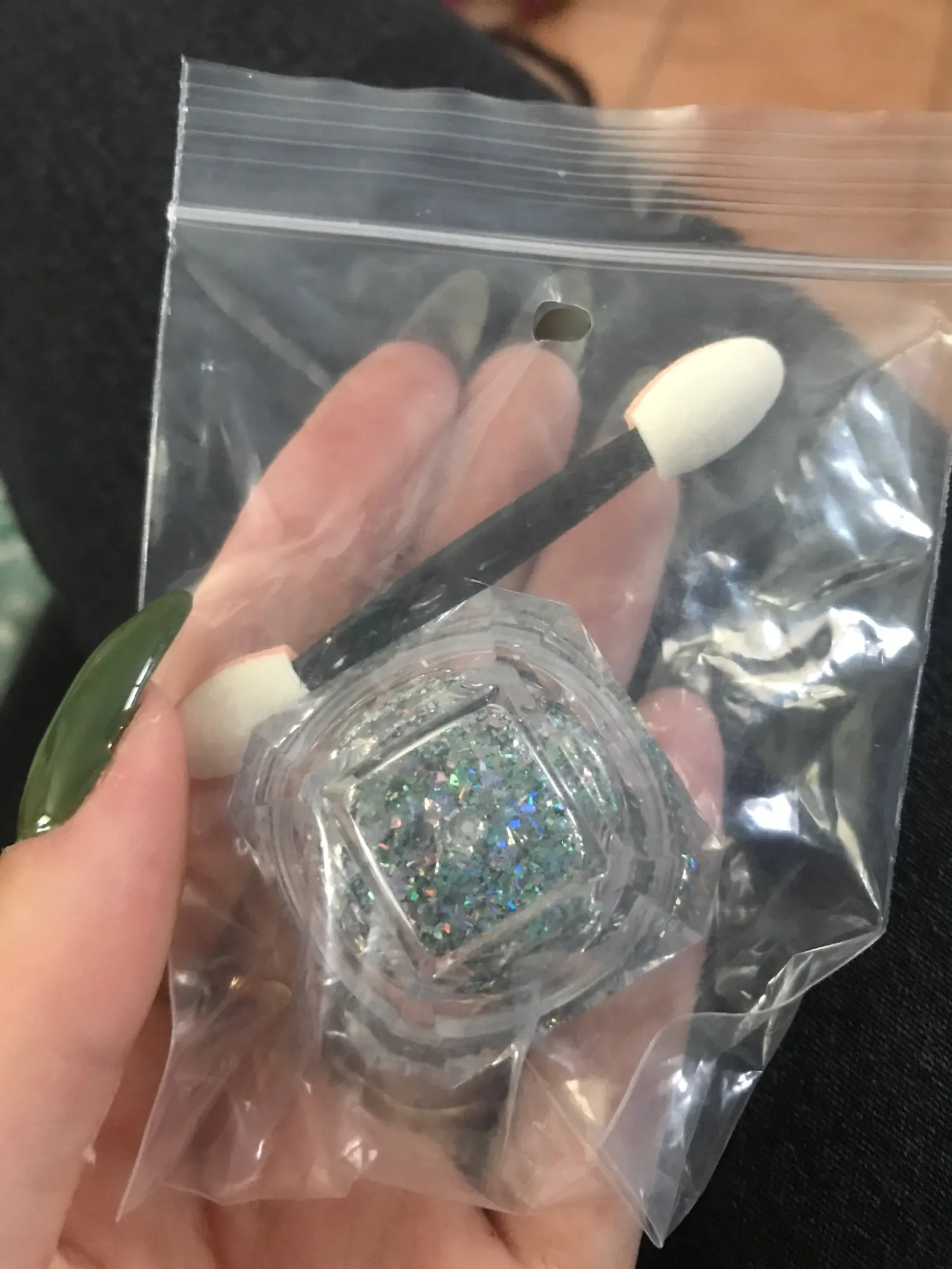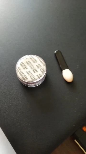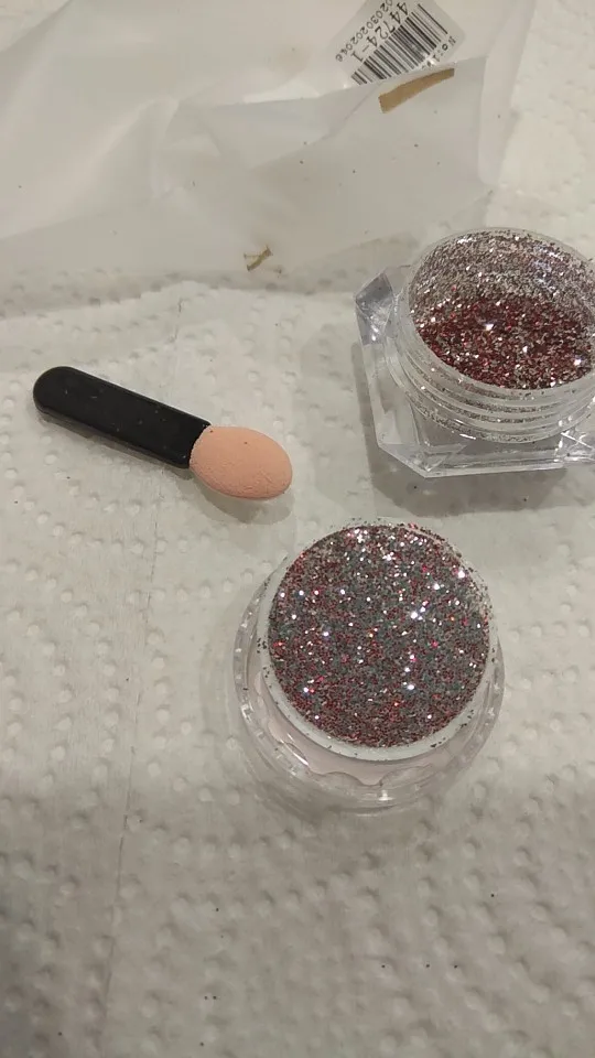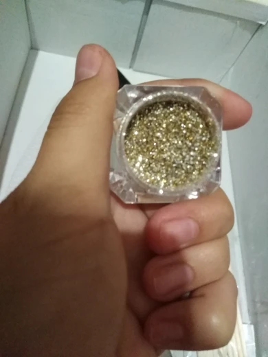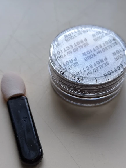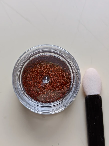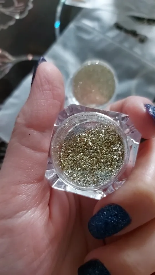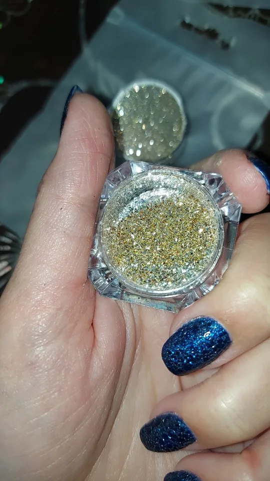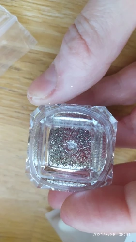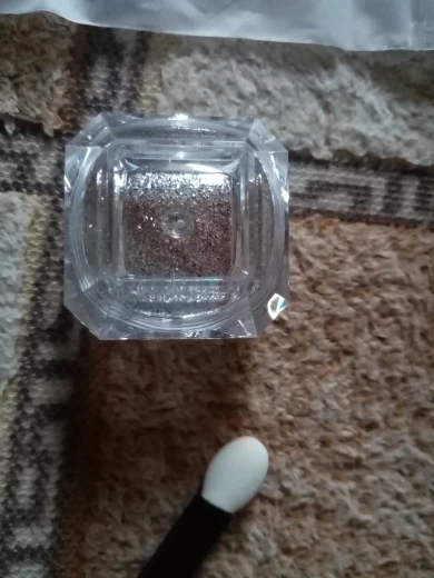 Втирка со средними по размеру частичками, хорошо ложится на липкий слой или в смеси с базой. Эффект чуть слабее чем на фото, но скорее всего зависит от способа нанесения. Баночка завинчивается, ничего не просыпается. В комплекте спонж для нанесения, но удобнее кистью.