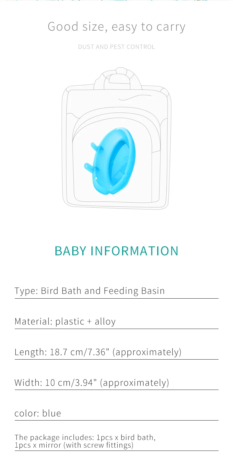 Package includes1pcs x Small Bird Bath Basin,1pcs x Mirror(with screws accessories)