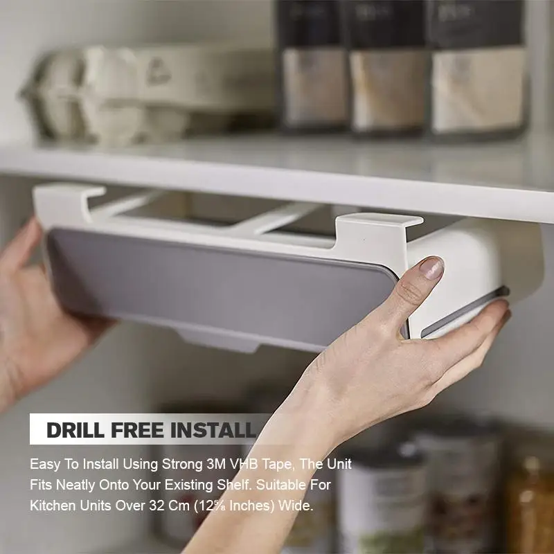 Легко установить с помощью прочной ленты 3M VHB, устройство аккуратно помещается на существующую полку. Подходит для кухонных блоков шириной более 32 см (12 ⅝ дюймов).