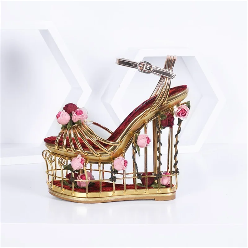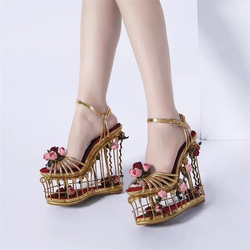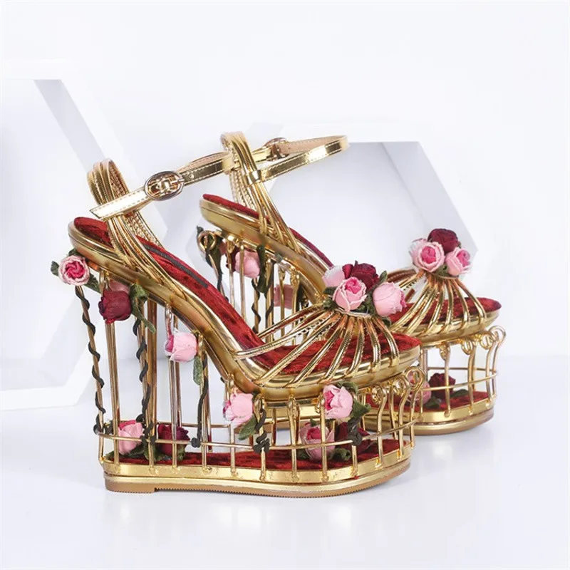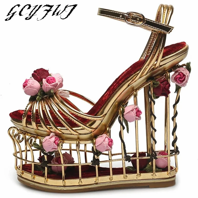 Летние женские босоножки с цветами туфли на очень высоком каблуке 15 см на толстой подошве; Женская обувь с резным узором на высоком каблуке Свадебная вечеринка сандалии с пряжками, женская обувь