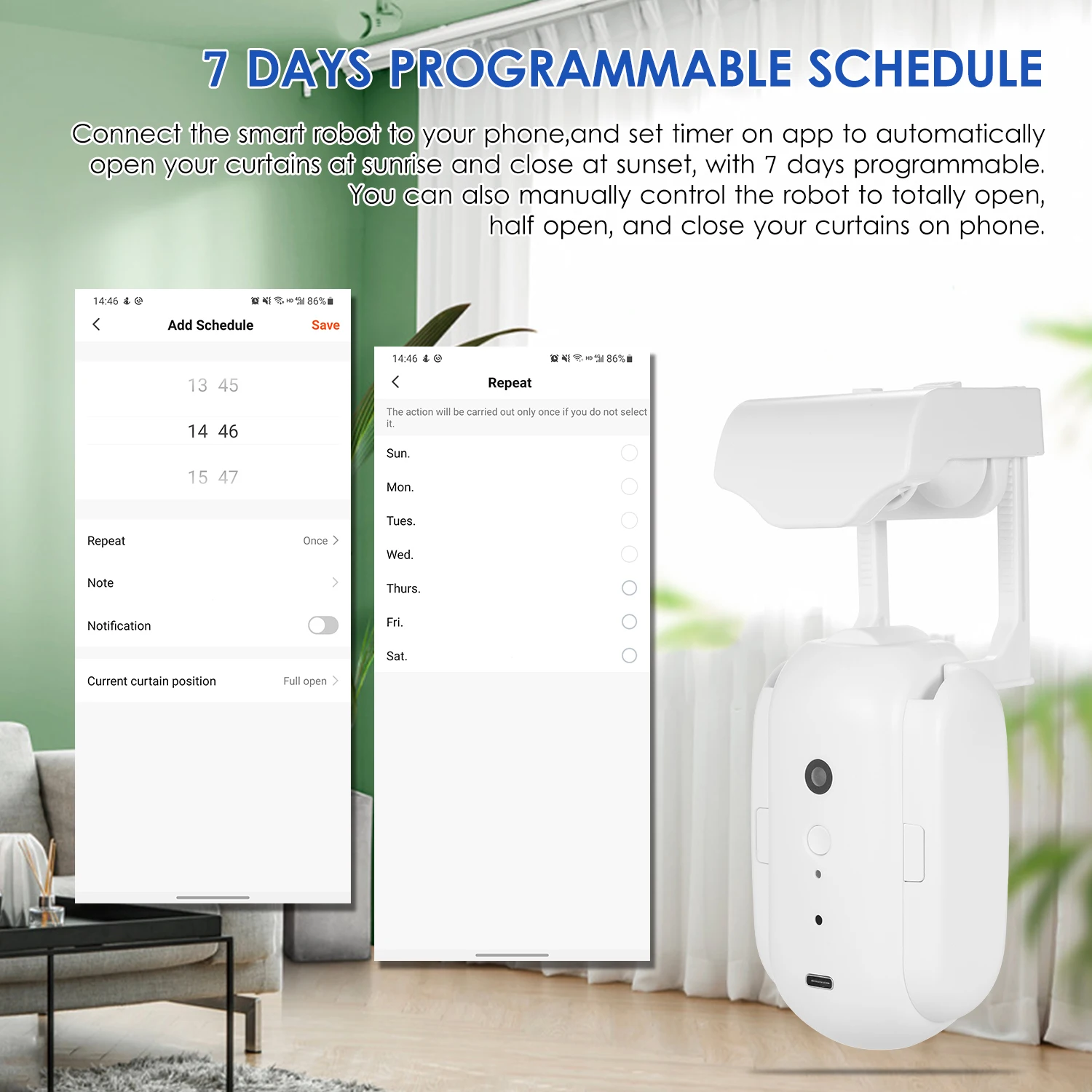 Особенности:Чрезвычайно прост в использовании-Подключите умный робот к своему телефону через BT и установите расписание/таймер в приложении, чтобы автоматически открыть шторы на рассвете и закрыть на закате, с программируемой 7 дней. Вы также можете вручную управлять роботом, чтобы полностью открыть, наполовину открыть и закрыть шторы на телефоне.Умные датчики-Оснащен окружающей среды светильник датчик и датчик температуры, робот может быть создан для того, чтобы автоматически закроет шторы в тех случаях, когда она определяет ваше комнатной температуре свыше 25 ℃, яркость более 30%. Температура может быть установлена в пределах 10-60 ℃, а светильник может быть установлен в пределах 10-90%.Пульт дистанционного управления и Голосовое управление-Используйте голосовые команды, такие как «нарисуйте/выводите штор», чтобы управлять роботом штор, добавив умный концентратор/контроллер, чтобы он был совместим с/заменен для Amazon Alexa, Google Assistant, T-mall Genie и т. Д. И это позволяет удаленно закрывать шторы от миль на телефоне, когда вы выходите, чтобы защитить вашу мебель, домашних животных, Аквариум от воздействия солнечных лучей.Простота установки-- Простая установка, никаких инструментов не требуется, что занимает всего 30 секунд, чтобы закончить. Различные типы роботов для вас на выбор, подходит для I-rail, U-rail, шторной дорожки и штанги (пожалуйста, подтвердите размер вашей шторной дорожки перед покупкой).Супер длительный срок службы батареи-- Со встроенной литиевой батареей 4000 мАч, умный занавес может работать около 6 месяцев, если он закрывается/открывается два раза в день, без хлопот часто перезаряжать его.Примечание:* Пожалуйста, подтвердите размер вашего трека для штор перед покупкой.* Для функции голосового управления и дистанционного управления требуются умный концентратор и ворота.Характеристики:Материал: АБС-пластикЦвет: белыйПодходящий тип карниза: T-Track (I-rail) /Внутренняя рифленая (U-rail) /карниз (опционально)Номинальная мощность: 1 ВтНапряжение двигателя: 5 ВНоминальный крутящий момент: 3 кгСкорость: 20 секунд/метрПодвижное расстояние: максимальное расстояние обучения составляет 20 метровЕмкость аккумулятора: 4000 мАч литиевая батареяUSB Порты и разъёмы: 5V, 1A, Тип-CПереход в режим ожидания Мощность Потребляемая мощность: 600μAВремя работы: около 6 месяцев, если открыть/закрыть два раза в деньТовар Размеры: 17,5*6,5*6,5 см/6,88*2,55 * 2.55inВес изделия: 280 г/9,87 унцийРазмер посылка: 22*21*7,5 см/8,66*8,26 * 2.95inПосылка Вес: 910g/32,09 ozУпаковочный лист:2 * Робот для штор2 * USB кабель1 * Руководство пользователя