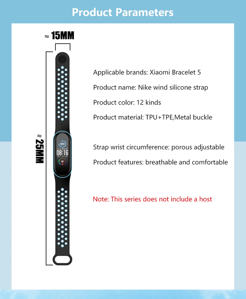 Применимые бренды: браслет Xiaomi 5Название продукта: силиконовый ремешок Nike windЦвет изделия: 12 видовМатериал изделия: ТПУ + ТЭП, металлическая пряжкаОкружность запястья ремешка: пористый адиабетХарактеристики продукта: дышащие и удобные: эта серия не включает в себя хост