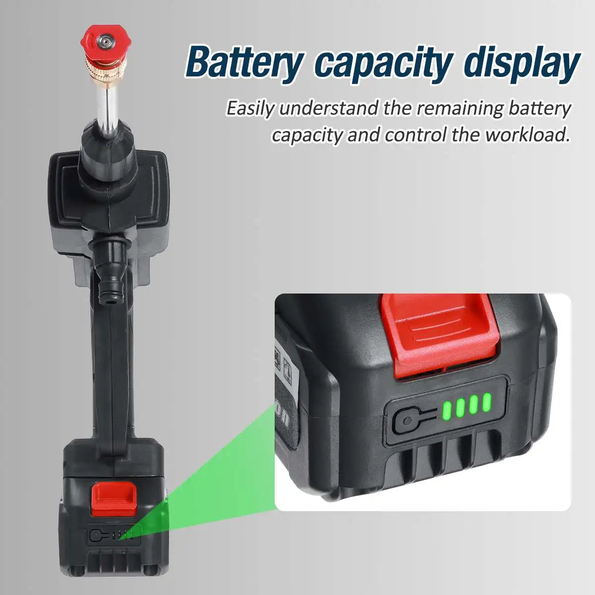 Особенности:● Светодиодный дисплей батареи, легко понять оставшуюся емкость аккумулятора и контролировать рабочую нагрузку.● Мощный полностью медный мотор, мощная.● Высокая скорость, устойчивая работа, долгий срок службы и отсутствие ожога.● Легкое хранение без места.● Нет необходимости в источнике питания, больше не ограничено источником питания, мыть, как вы хотите.● Портативный самовсасывающий, более быстрый и прочный, встроенный фильтр из нержавеющей стали, Высокоэффективная и глубокая фильтрация примесей в воде.● Многофункциональный водяной пистолет может переключать тип воды по желанию, и поток воды может регулироваться постепенно от маленького до большого, вращая насадку, И вентилятор и Прямая регулировка водной линии могут быть переключены по желанию.● Идеально подходит для полива сада, орошения в сельском хозяйстве, мытья автомобилей, уборки дома и т. д.