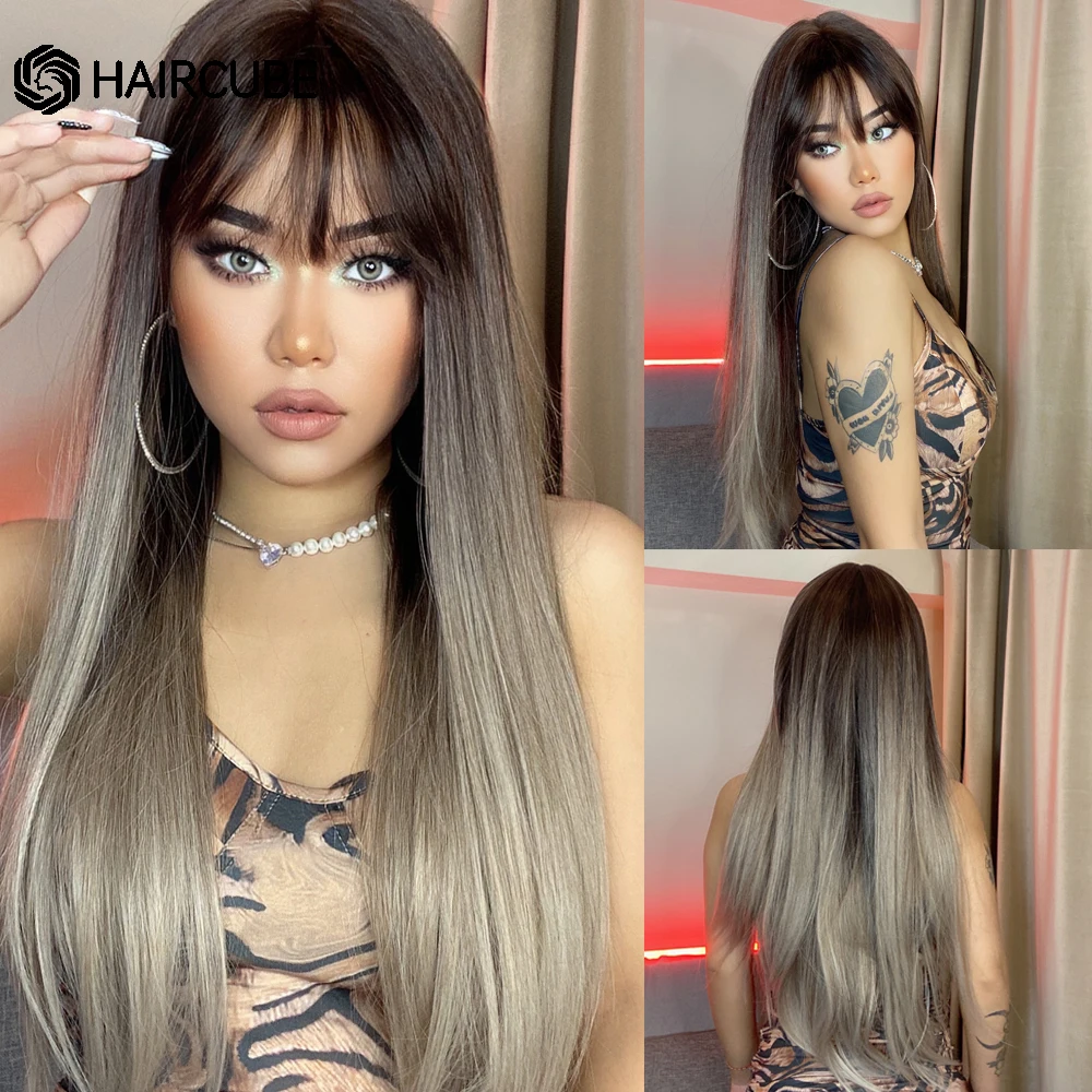 Длинные прямые синтетические парики с челкой, Омбре, пепепельно-кор...