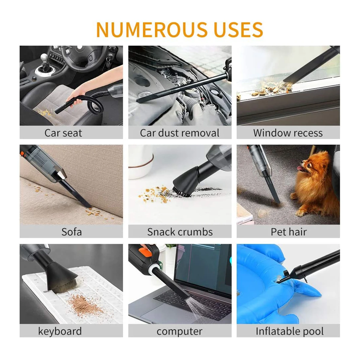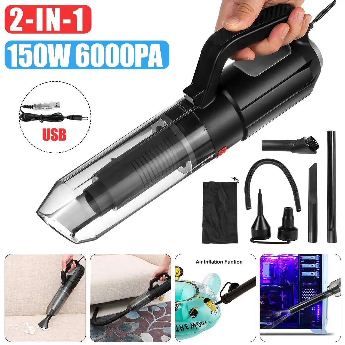 2-в-1 беспроводной автомобильный вакуум предохранительный очиститель Портативный USB пылесос воздуходувка 6000PA【DUAL FUNCTION】It является 2-в-1 устройство, которое работает как со сжатым воздухом и пылесос. Одна сторона очистителя выдувает, а другая сторона поглощает пыль, обеспечивая эффективную процедуру очистки.【Мощный всасывающий 】с градусом вакуумирования 6000 па и объемом выдувного воздуха 4500FT/мин, наш беспроводной пылесос может производить сильное всасывание. Вы можете легко очистить свой офисный стол, автомобильные аксессуары и многие другие места с помощью нескольких удлинительных аксессуаров. Этот мини-пылесос также идеально подходит для очистки труднодоступных мест, потому что мы распределили различные удлинительные трубы.【Моющийся фильтр-экран 】съемный и моющийся дизайн фильтра, долговечность на длительное время, не нужно часто заменять.【Мощный вентилятор 】 с максимальной скоростью двигателя 33000 об/мин, этот Электрический Сжатый воздух может производить в 10 раз более сильную тягу воздуха, 28 м/с. Эта движущаяся сила может даже очищать микроскопические частицы пыли.【Перезаряжаемый и ручной работы 】 встроенный литиевый аккумулятор емкостью 6600 мАч, этот беспроводной пылесос обеспечивает быструю зарядку. После полной зарядки он может работать до 30 минут при растяжении. Вы можете повторно использовать этот перезаряжаемый сжатый воздух, как много раз по мере необходимости. Своему уникальному двусторонний карманный дизайн и Интегрированный Светодиодный ламп делают портативный пылесос более реальным в использовании.【MULTIPURPOSE】You может использовать эти беспроводные воздуходувки продуктов, таких как «2 в 1» для того чтобы очистить клавиатура компьютеров, ноутбуков, машин скорой помощи, камеры, медицинское оборудование, модели автомобилей, жалюзи, сухом элементе или мокром покрытии, И любые другие труднодоступные места.