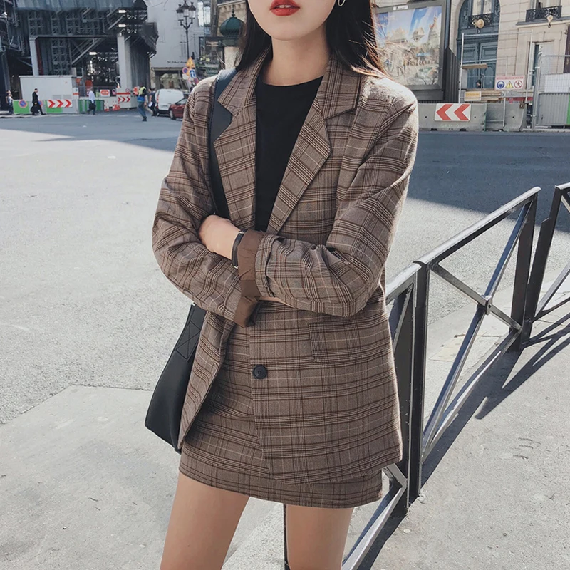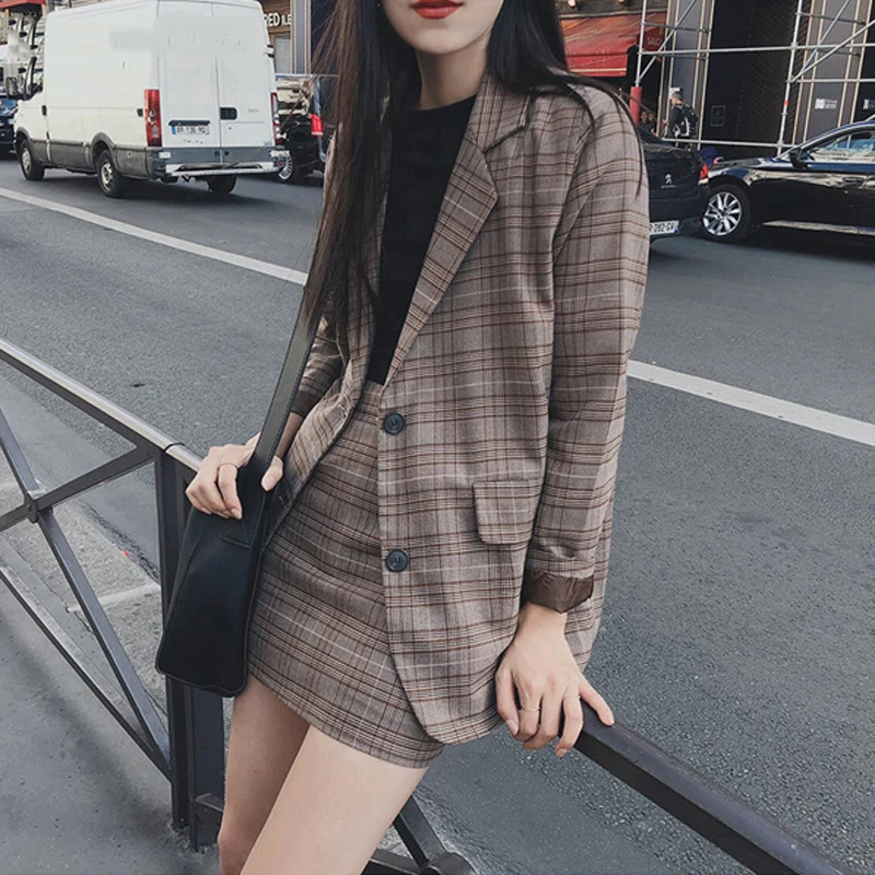 Комплект из двух предметов для женщин в винтажном стиле в клетку Однобортный пиджак юбка карандаш костюмы комплекты одежды с блейзером, офисные женские костюмы