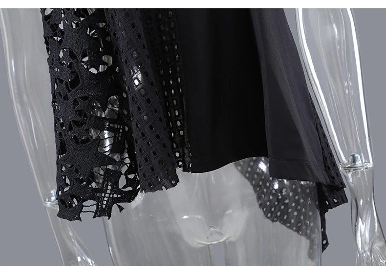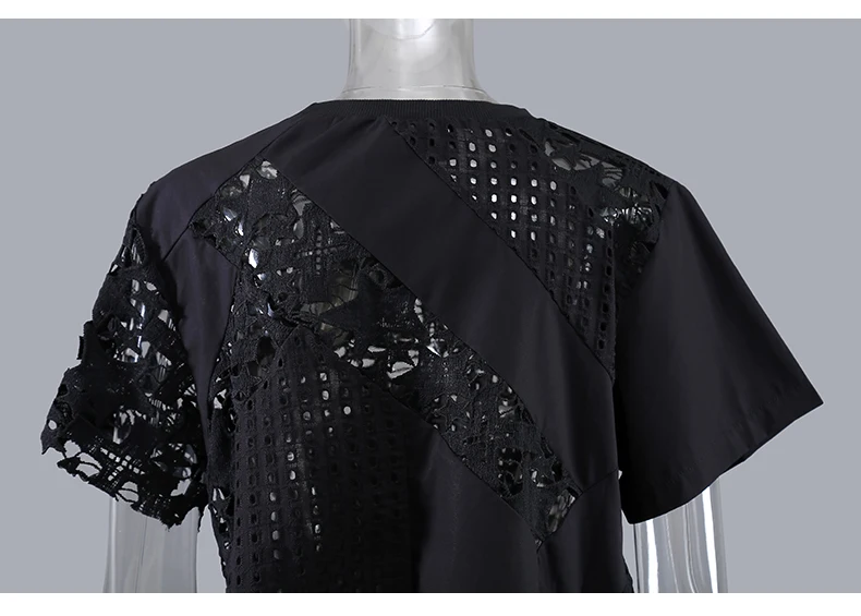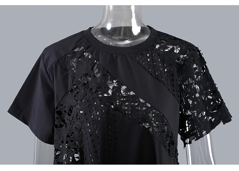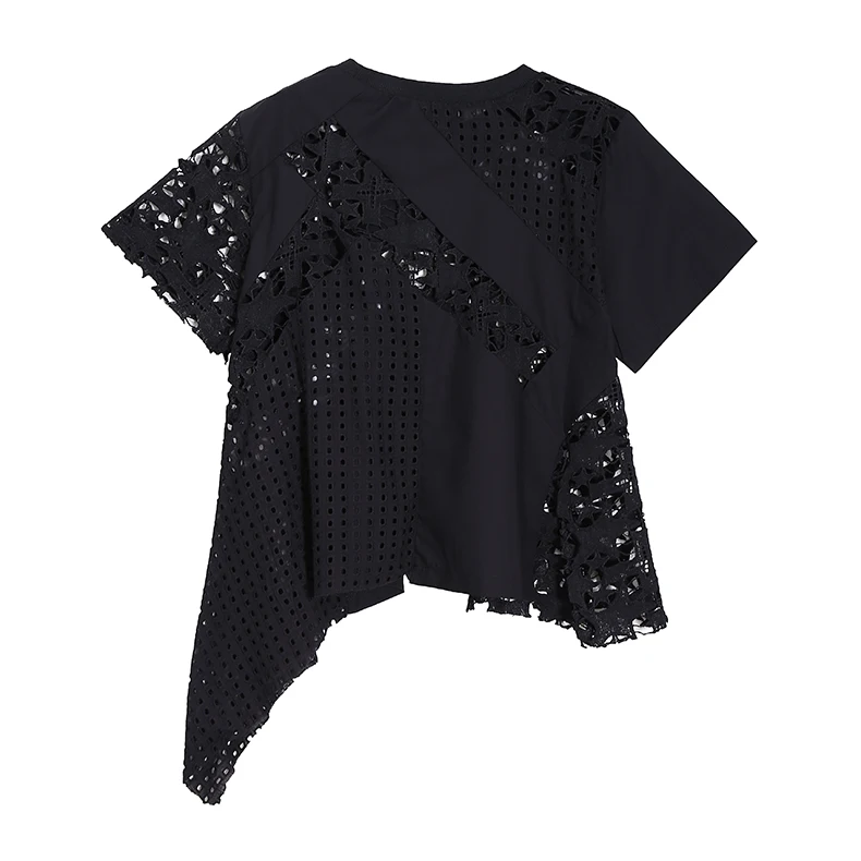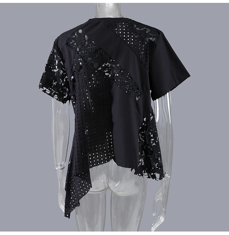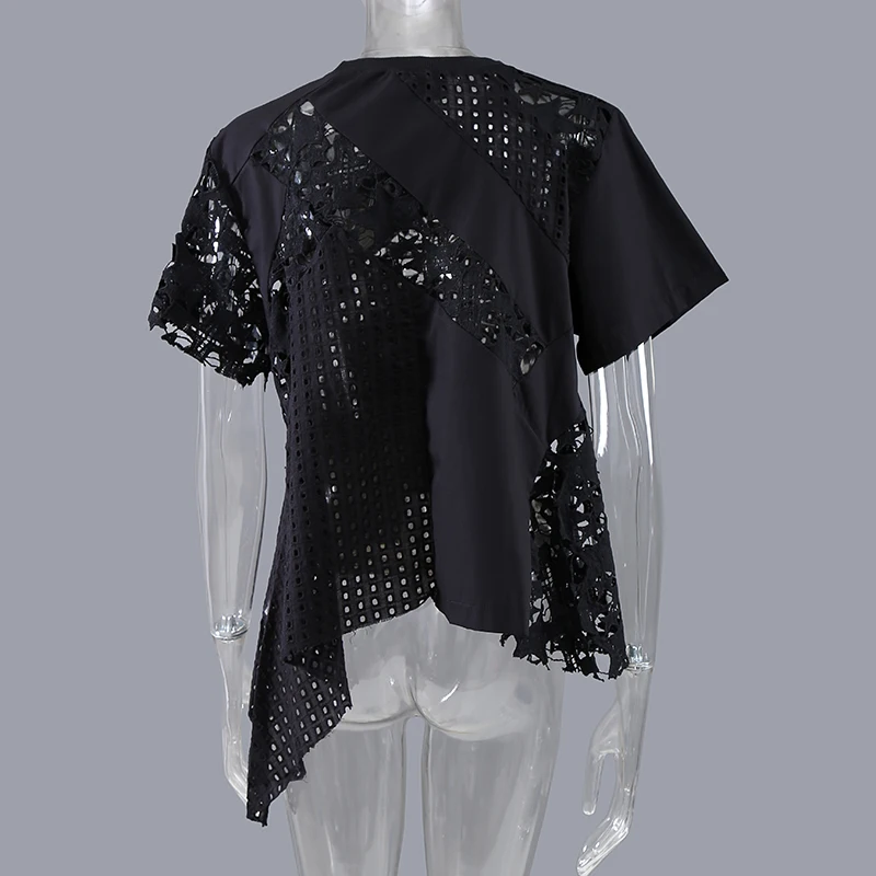 Новинка; Женская однотонная черная футболка с короткими рукавами; Асимметричная футболка с кружевом в стиле пэчворк; Необычная футболка для девочек; Уникальный Повседневный стиль; Футболка; 8487