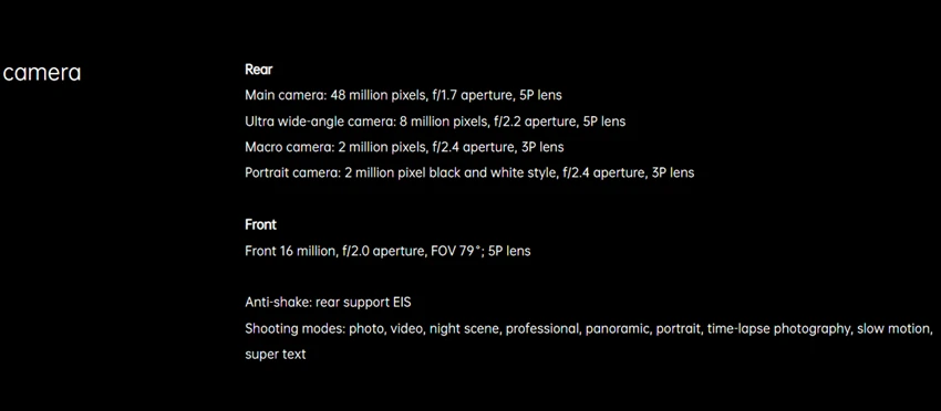 Восьмиядерный процессор Dimensity 7206 ГБ ОЗУ 128 Гб ПЗУ6,5 дюймов 2400x1080 90 ГцАккумулятор: 5000mAhlithium-ion, быстрое зарядное устройство 30 ВтФронтальная камера 16.0MP задняя панель 48.0MP + 8.0MP + 2.0MP + 2.0MPПоддержка отпечатков пальцев, распознавания лиц, Google Playstore,OTA, OTG