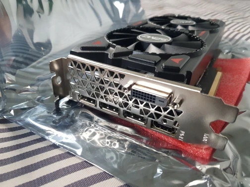 Карта новая. Хоть и выглядит, как игрушечная, но работает нормально. Греется значительно сильнее брендовых, но это и неудивительно при таком мелком радиаторе. Память Micron, но разогналась нормально (32 MH). При заказе не забывайте, что ещё надо будет заплатить таможенный сбор (при цене карты 30 тысяч это ещё плюс 2.5 тысячи).
