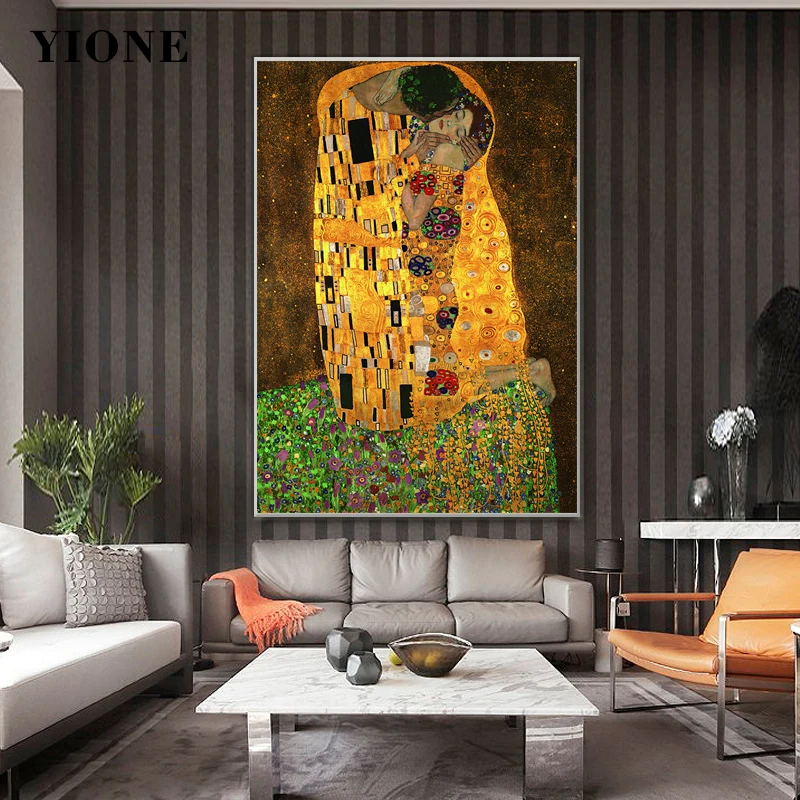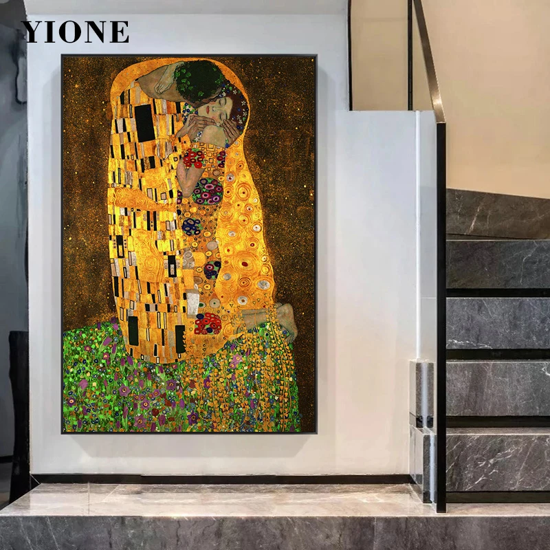 Поцелуй Картина маслом известная абстрактная желтая ретро мужская женщина с цветами трава Холст плакат Настенная картина для гостиной