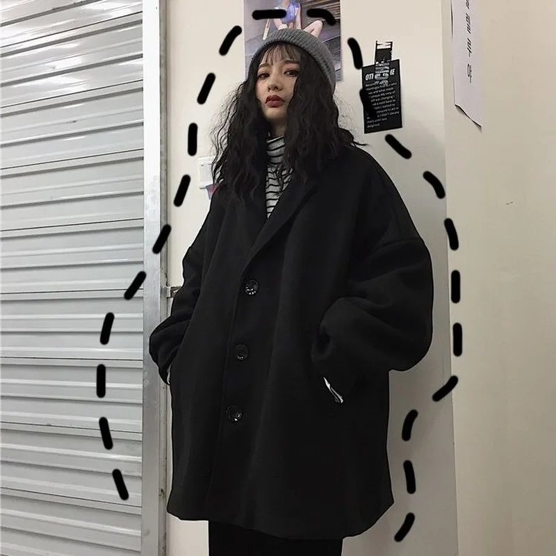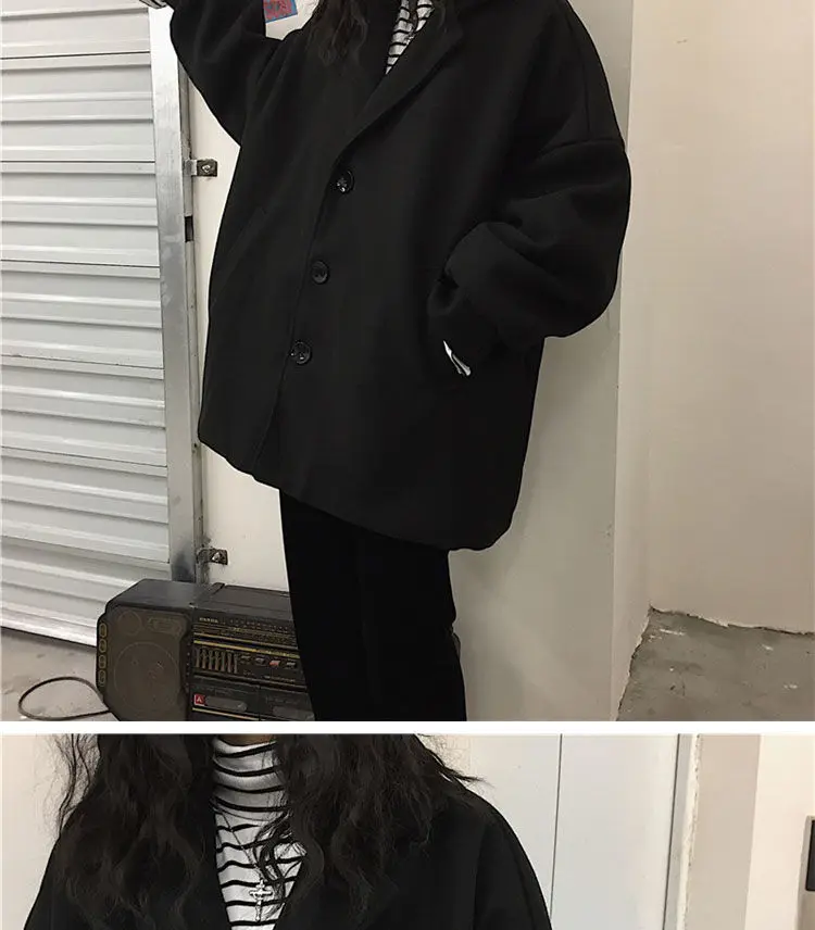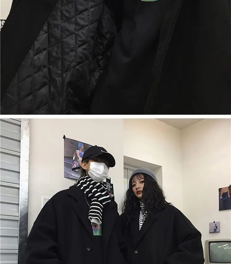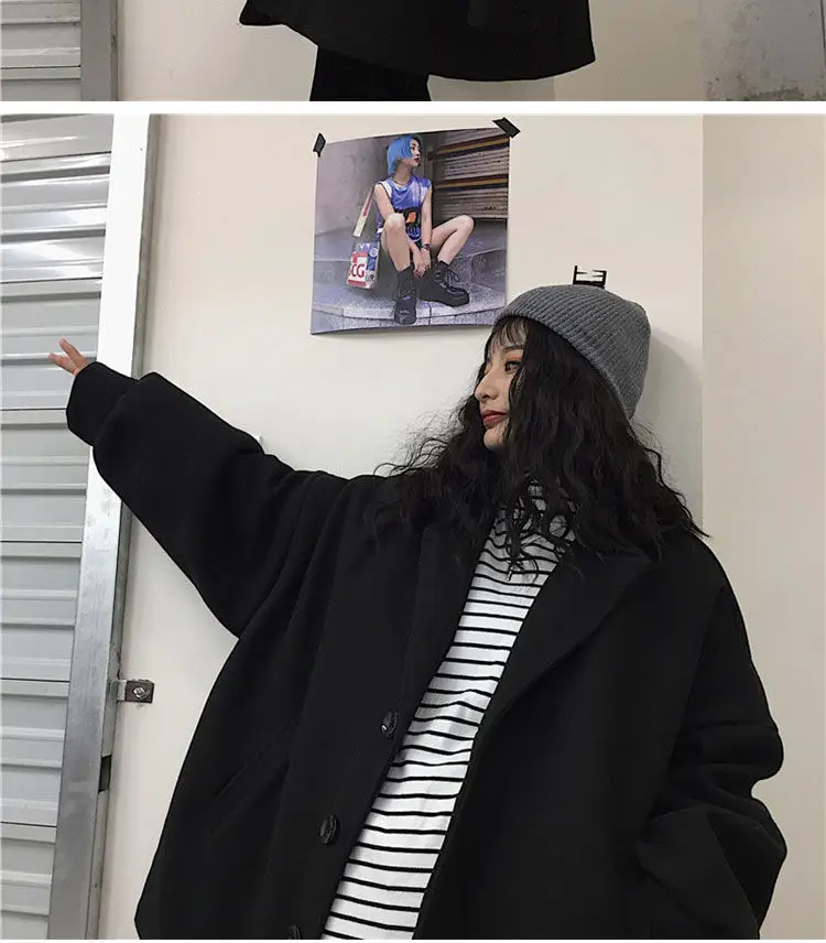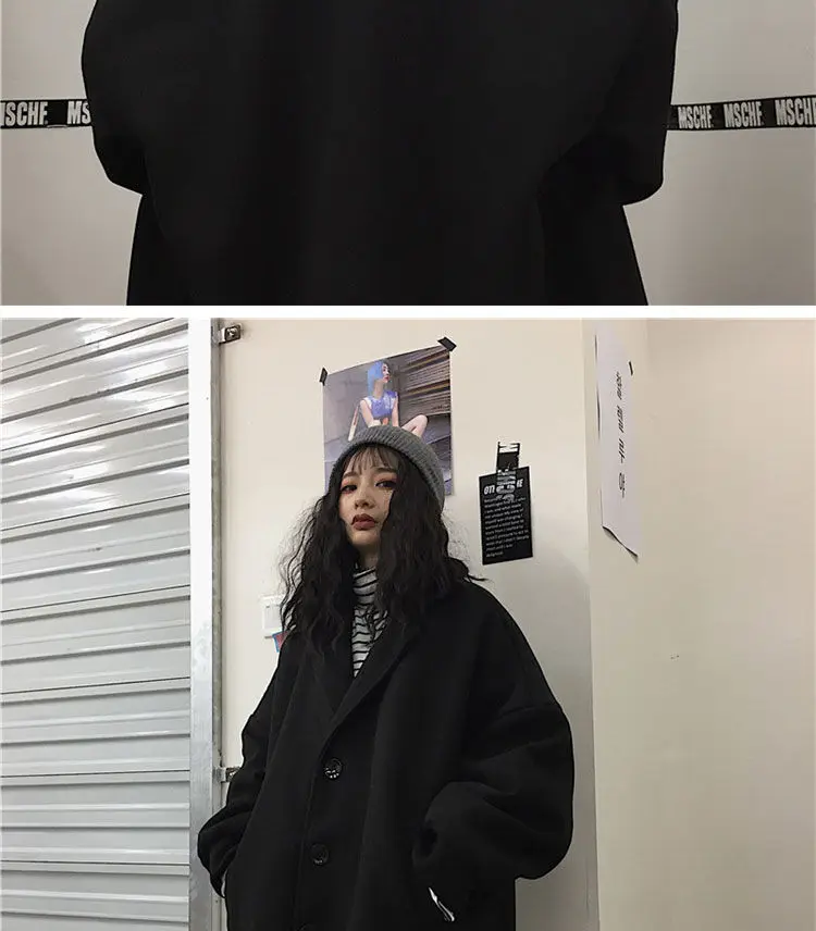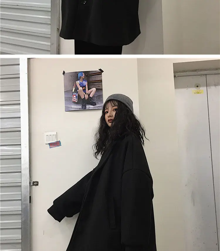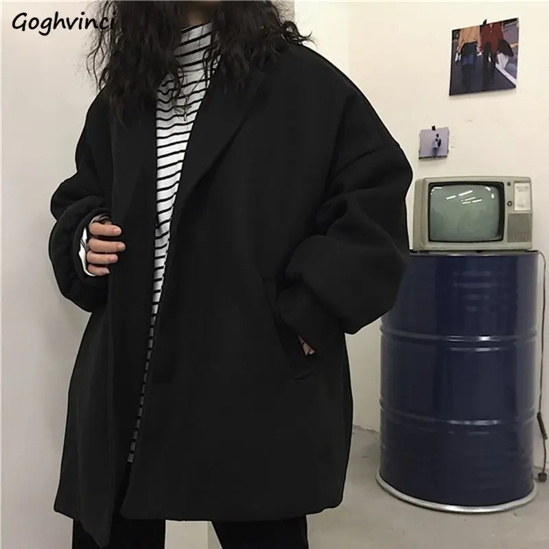 Женское однотонное пальто из смешанной шерсти, черное однотонное повседневное утепленное пальто с бархатной подкладкой в Корейском стиле для отдыха, модное Простое Шерстяное пальто в стиле Харадзюку