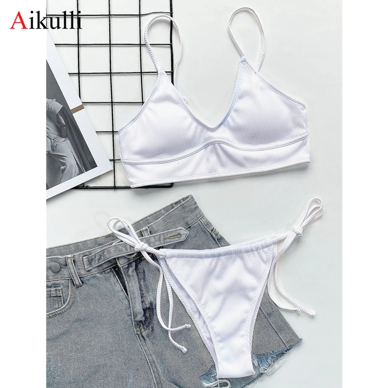 2021 сексуальные белые бразильские бикини, купальные костюмы, Женская однотонная ребристая одежда для плавания, комплект бикини из двух предметов, пляжная одежда, женский купальный костюм для плавания