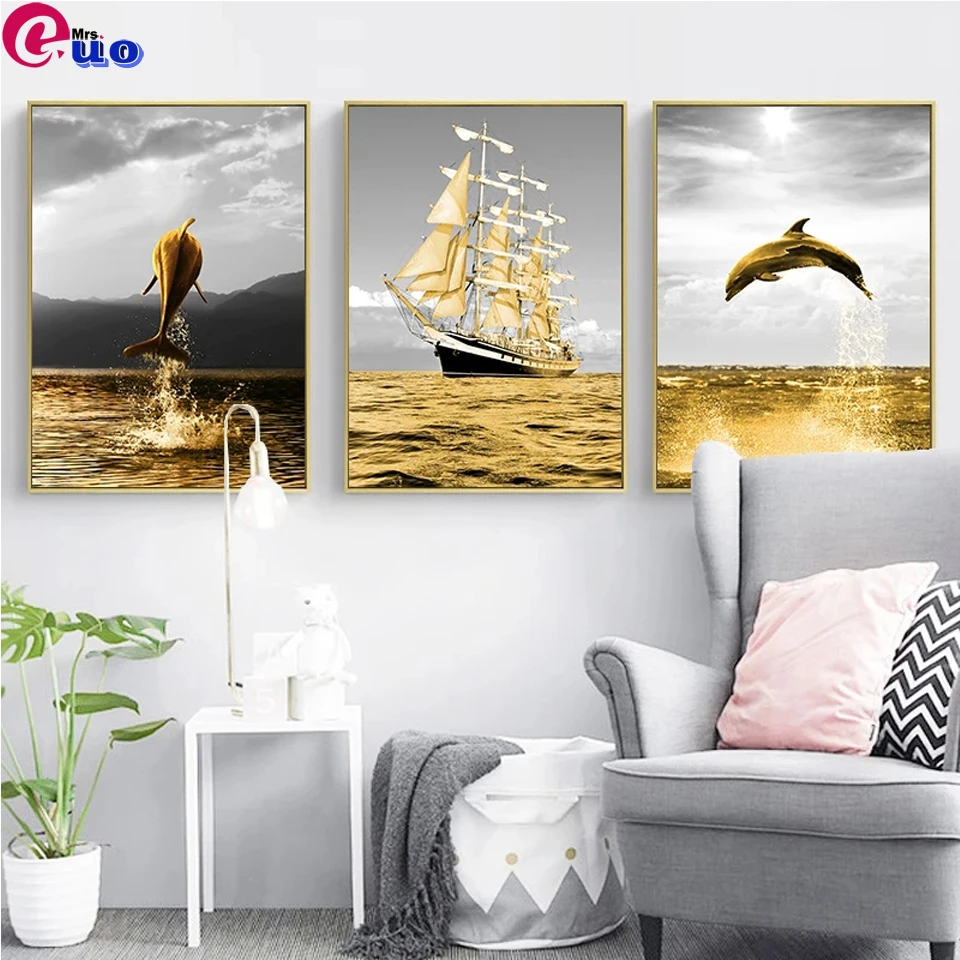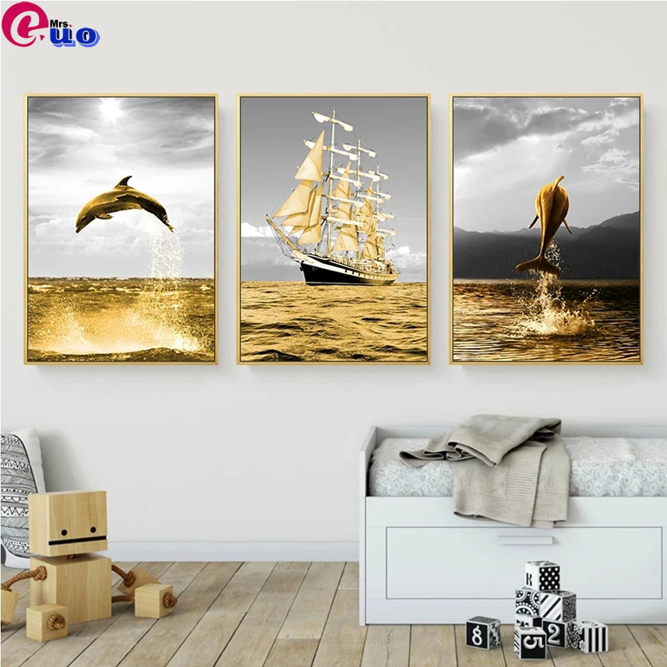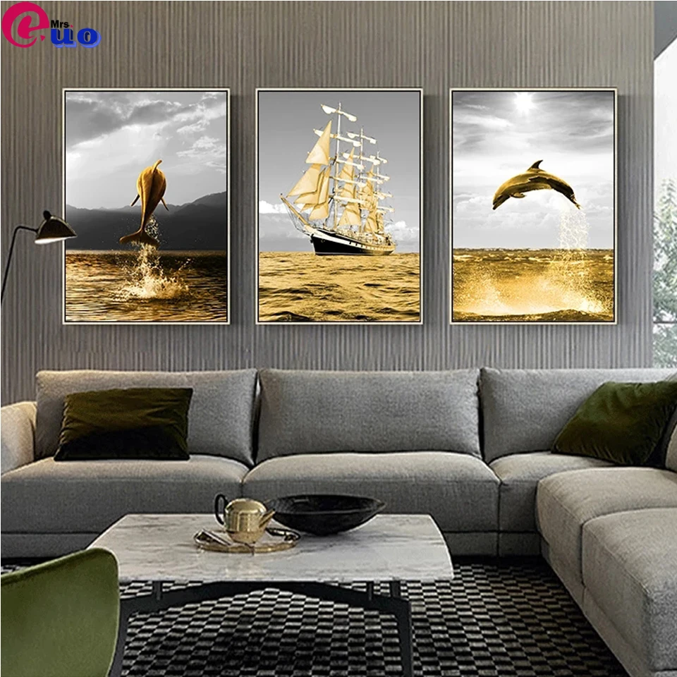 Пейзаж Алмазная Картина золотой Дельфин парусный 5d Сделай Сам полный квадратный Круглый Алмаз Вышивка крестом животное домашний декор
