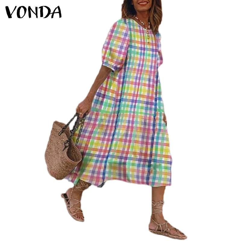 VONDA женское платье 2021 повседневные платья с коротким пышным рукавом для вечеринки винтажный клетчатый длинный сарафан в богемном стиле Vestidos Robe