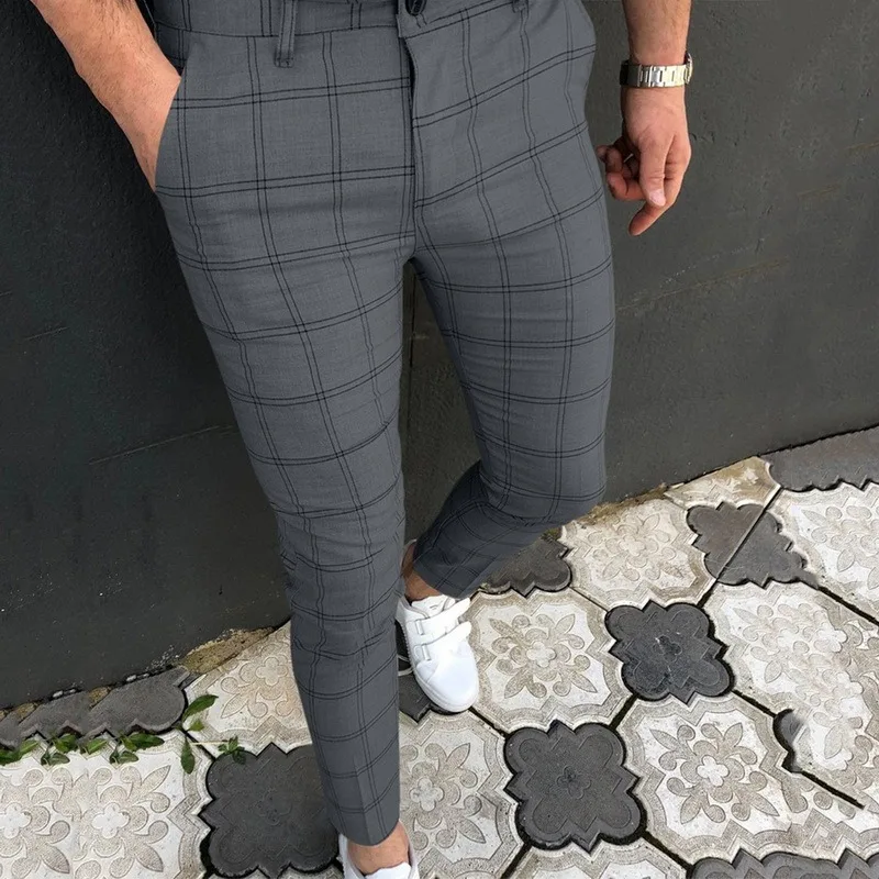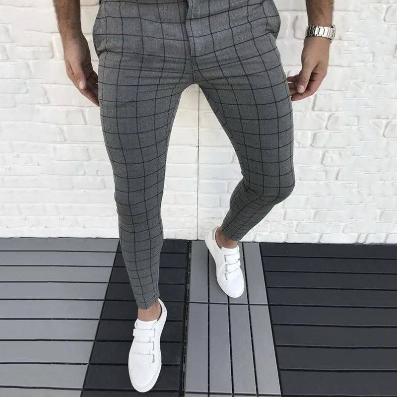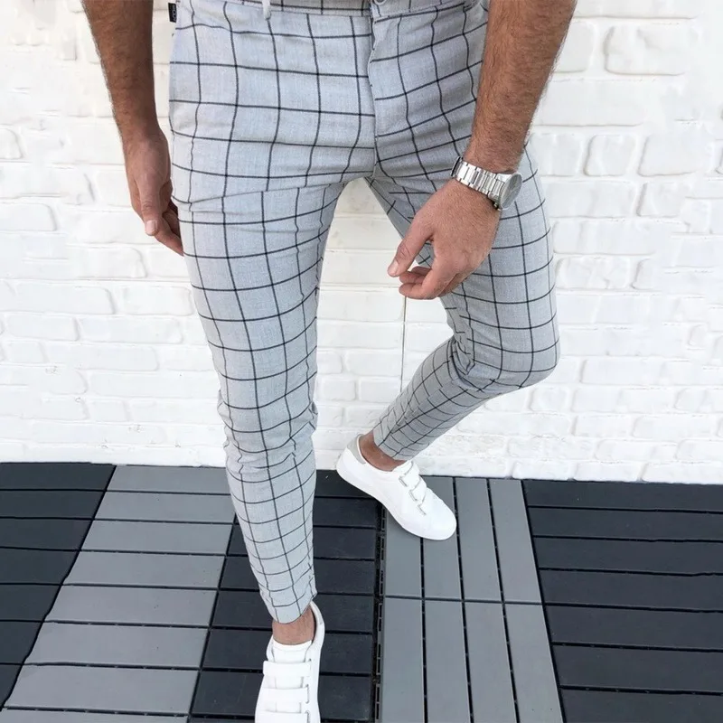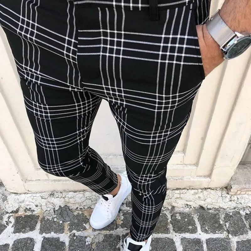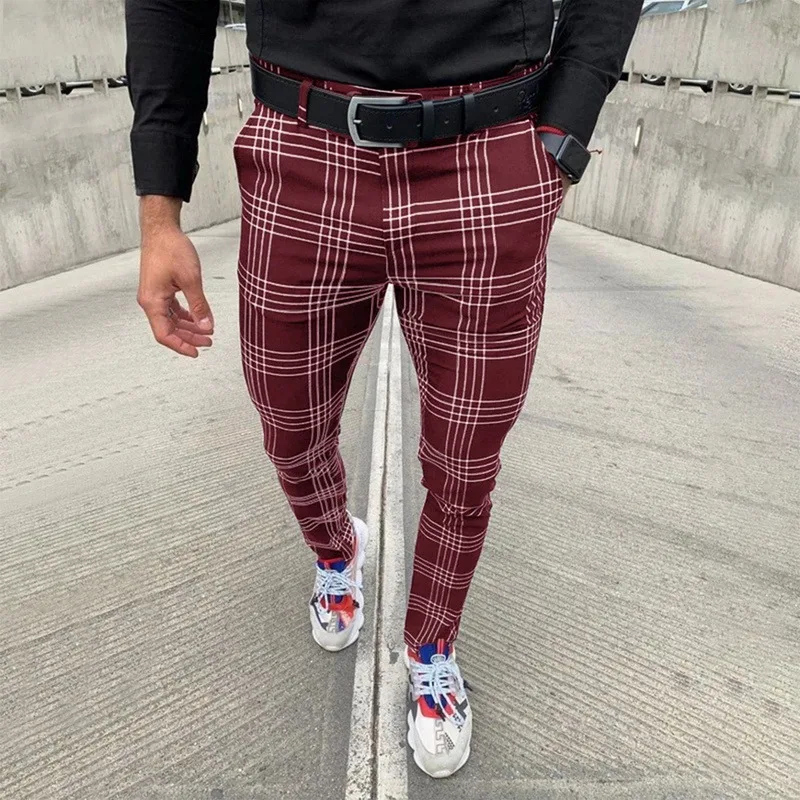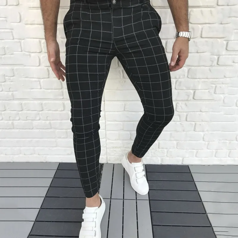 Брюки мужские в клетку, модная повседневная одежда, тонкие Джоггеры со средней талией, брюки-карандаш