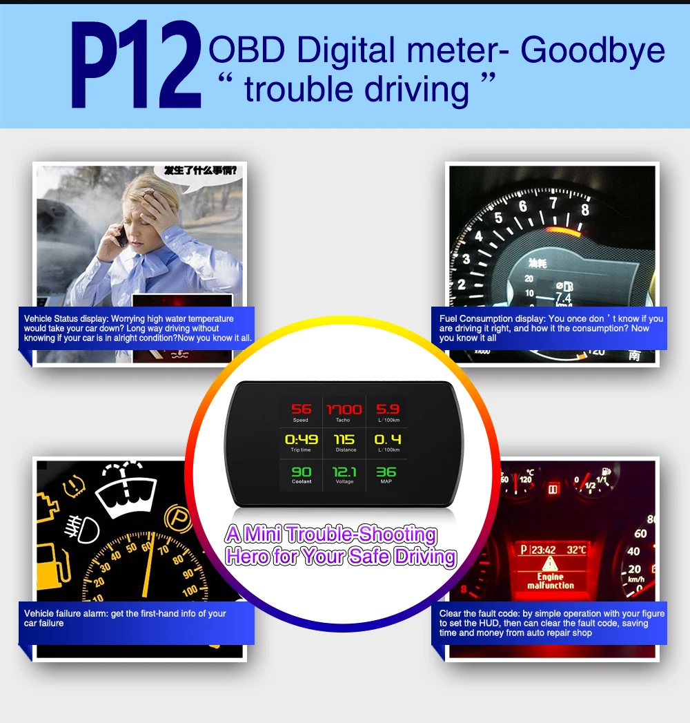 Особенности: 1. Подключи и играй подключение с любым OBDII или EUOBD способным транспортным средством; 2. 2D визуальный эффект 3. Экран "3" 4. Многоцветная конструкция облегчает чтение на экране важных деталей для быстрого просмотра; 5. Использование нанотехнологий для устранения нежелательных отражений облегчает Чтение информации; 6. Возможность отображения огромного диапазона статистики автомобилей, включая: скорость, скорость вращения двигателя, температуру воды, напряжение батареи, мгновенное потребление топлива, среднее потребление топлива, местное время, время одиночного вождения, измерение пробега, напоминание о смене, напоминание об утомленном драйвере, Сигнализация низкого напряжения, высокотемпературная сигнализация, сигнализация скорости, сигнализация о неисправности двигателя, Устранение кода неисправности, возможность изменения единиц, например, километр/миля 7. Автоматическое включение и выключение с транспортным средством 8. Автоматический и ручной режим регулировки яркости Установка: Посылка включает в себя: