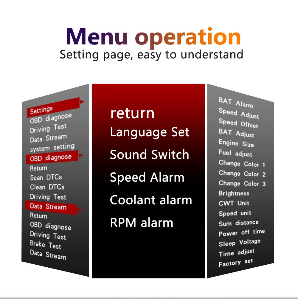 Особенности: 100% совместимость OBD + GPS Двойная система HD дисплей, нет двойного изображения, четкий эффект в дневное время Металлическая нанотехнология на лицевой стороне для удаления нежелательных отражений для более четкого отображения OBD + GPS 2 в 1 двойная рабочая система, которая может работать на всех транспортных средствах. Спецификация: Посылка включает в себя: