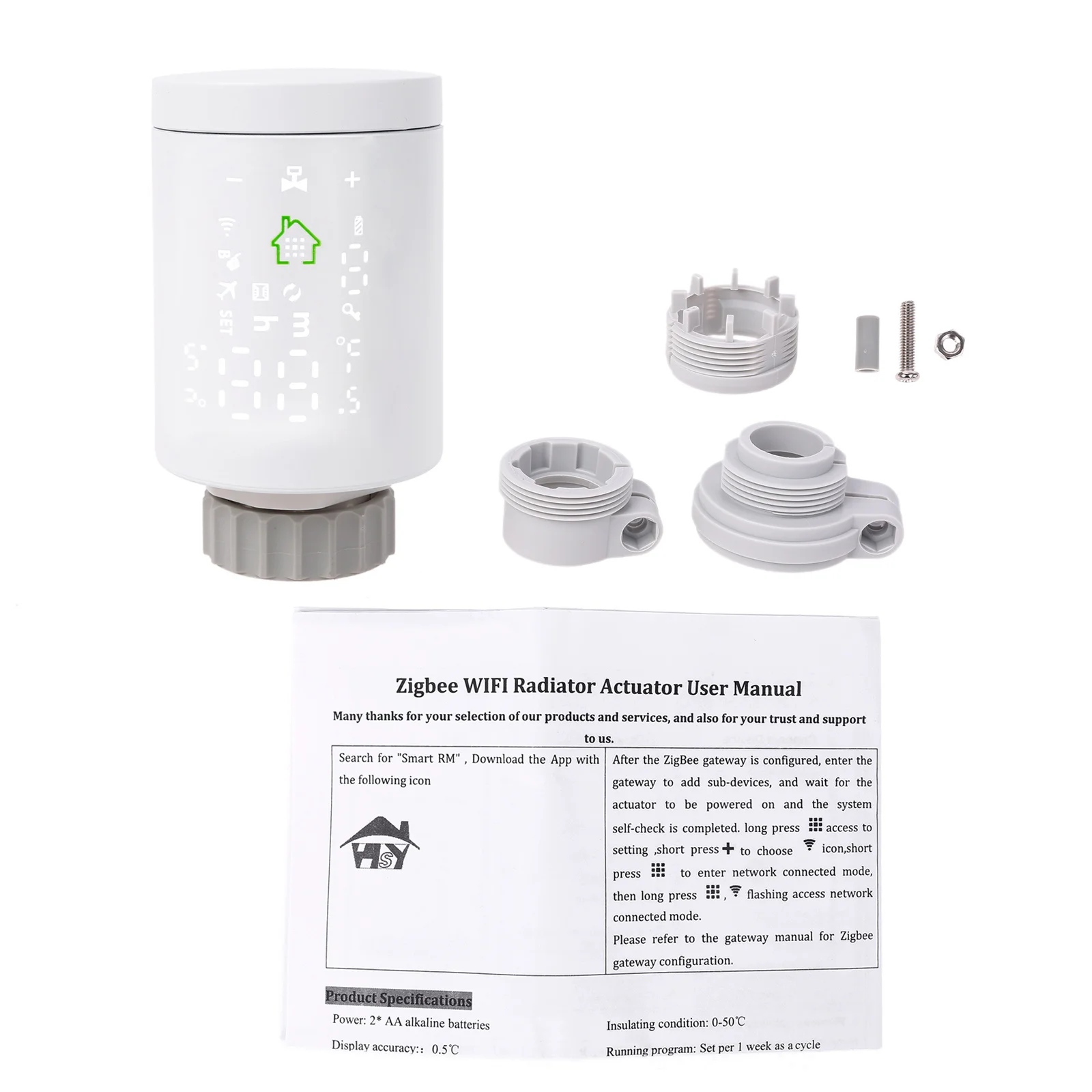 TUYA Zigbee3.0 TRV термостат-клапан термостатический радиатор комнатный Программируемый Регулятор температуры Голосовое управление работает с Google-Home & AlexaОсобенности продукта:1. Умный Tuya ZigBee радиатор привод термостат:С ЖК-дисплеемДве секции аккумуляторов AA,Специальный клапан используется совместно с нагревательным радиатором.Искусственно устанавливаемая температура в помещении, в основном используется в системе напольного отопления для контроля закрытия и открытия трубы.2. Должен работать с беспроводным шлюзом Tuya ZigBee:Беспроводной концентратор ZigBee-это обязательное подключение к клапану многих других смарт-продуктов ZigBee для реализации всей связи ваших устройств умного дома.Просто добавьте свой шлюз в приложение, а затем добавьте привод радиатора к вашему шлюзу в приложении.3. Программируемый график с еженедельным выбором программ:Поддерживает ручную настройку 5 + 2,6 + 1 и 7 дней в неделю с 6 сроками для выбораПредоставьте вам максимальное удобство для различных ситуаций и установите Индивидуальный график для температуры вашего дома.Доступен праздничный режим, автоматический режим, режим boost. Выберите режим рабочего дня и отдыха, чтобы удовлетворить ваши потребности.4. Голосовое и дистанционное управление для беспроводного шлюза Tuya ZigBee:Пульт дистанционного управления с помощью вашего смартфона.Голосовое управление без рук через Alexa и Google-Assistant.5. Обнаружение открытого окна:Когда комнатная температура неожиданно опускается в порог температуры,-клапан закроется в течение 15 минут.После этого, если температура в помещении все еще ниже, чем температура. Порог, он сохранит этот режим.Легко читаемый цифровой дисплей с температурой Цельсия.Параметр:Источник питания: 2*2 AA * 1,5 V щелочные батареиМаксимальный ток: 90 мАТемпература рабочей среды: -10 ~ 60 °CДисплей точность: 0,5 ℃Диапазон регулировки температуры по умолчанию: 5 ~ 35 °CДатчик зонда: NTC(10k)1%Диапазон отображения температуры: 1 ~ 70 °CРазмер резьбы: M30 * 1,5Изоляционное состояние: нормальная средаРазмер: 53*89,5 ммЗапуск программы: установка в течение 1 недели в качестве циклаМаксимальная маршрут: 4,5 ммПосылка:1 * термостат радиатора1 * сумка для аксессуаров1 * Руководство пользователяВопрос и ответ:1. В: Могу ли я использовать свой собственный концентратор для подключения к клапану?О: Нет, этот термостат радиатора может использоваться только с нашим беспроводным шлюзом Tuya ZigBee. Мы также предлагаем комплект ступицы на ваш выбор.2. Вопрос: Можно ли установить этот термостат на дисплей по Фаренгейту?О: Нет, он может отображаться только с дисплеем по Цельсию.3. В: Могу ли я сам программировать расписание?О: Да, термостат программируется. Вы можете свободно программировать расписание.4. В: Могу ли я управлять термостатом, если меня нет дома?О: Да, так как успешно подключите его к концентратору, вы можете управлять своим устройством в вашем смартфоне в любом месте.5. Вопрос: Есть ли у термостата блокировка экрана, чтобы предотвратить действия гостей или детей с настройками?О: Да, есть. Он имеет полностью заблокированный режим, который предотвращает любые изменения или неправильные действия детей.6. Вопрос: включен ли аккумулятор?О: Нет. В качестве ограничения доставки аккумулятор не входит в комплект.