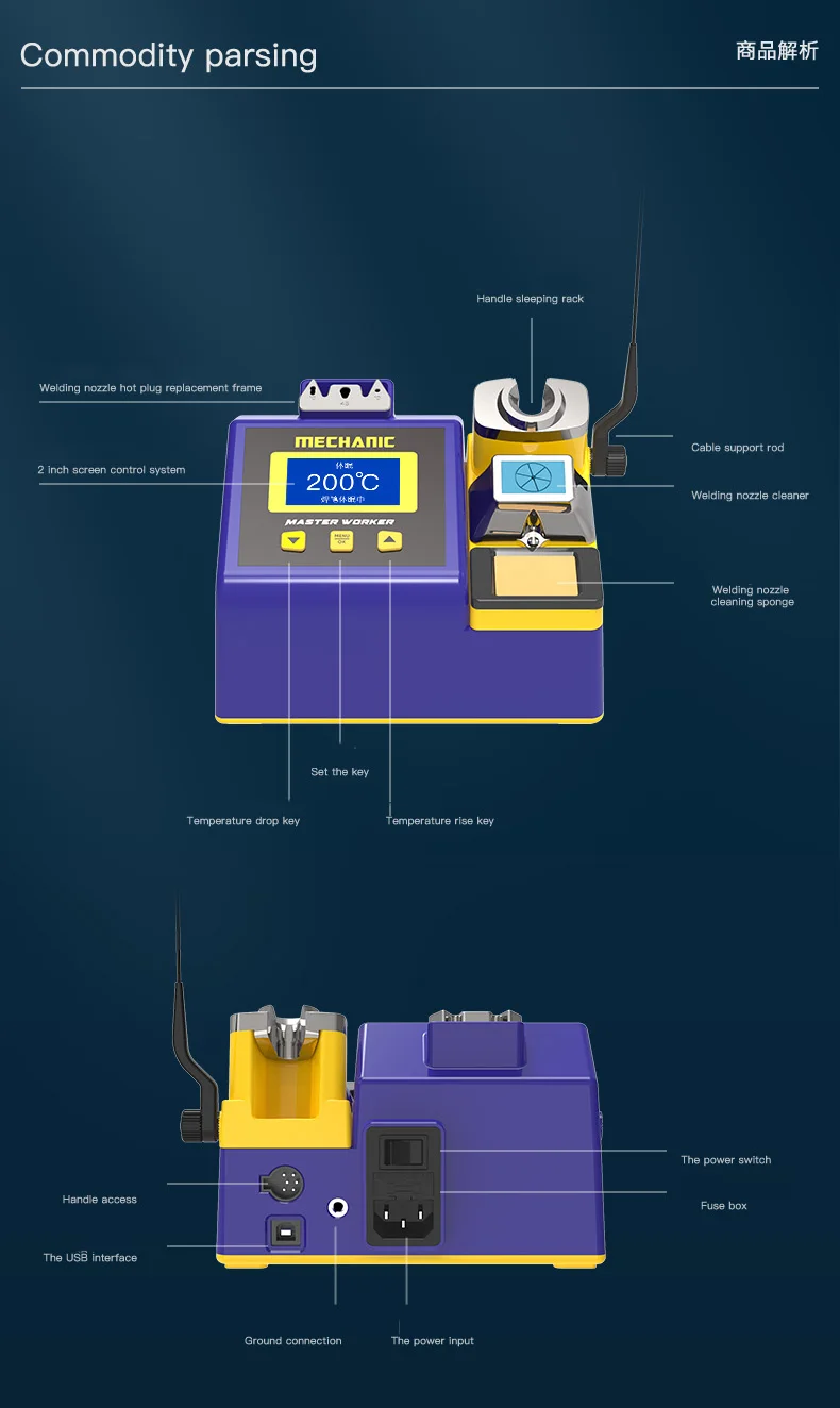 Механик MA-SD01 высокоточная паяльная станция высокой мощности для высокоточных SMT компонентовОсобенности продукта:1. Это прецизионная паяльная станция для электронных приложений с ручкой T115T115 ручка с 3 Наконечниками: модель T115tip (C115-TI.C115-TS.C115-SK)2. Механик MA-SD01 высокоточная паяльная станция высокой мощности для высокоточных SMT компонентов паяльная работа, 1 секундный нагрев, 2 секунды тонирование, 130 Вт Высокая мощность, 110 В/220 В переменного тока источник питания. Механик MA-SD01 высокомощная паяльная станция высокой мощности для высокоточных SMT компонентов паяльная работа, 1 секундный нагрев, 2 секунды тонирование, 130 Вт Высокая мощность, 110 В/220 В AC источник питания.3. Автоматическая Сварка размер пятна, температура и мощность автоматическая компенсация.4. Выход Мощность: 130W/23,5/9V5. Напряжение переменного тока: 230 В/120 В/110 В