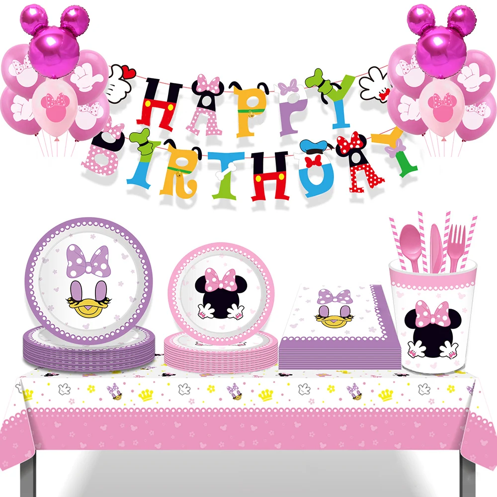 Disney наряд для первого дня рождения с рисунком Минни для девочек, крестильное платьице для малышей вечерние праздничные посуда 8 человек бумажные тарелки для дней рождения, папиросной бумаги чашки вечерние Декор