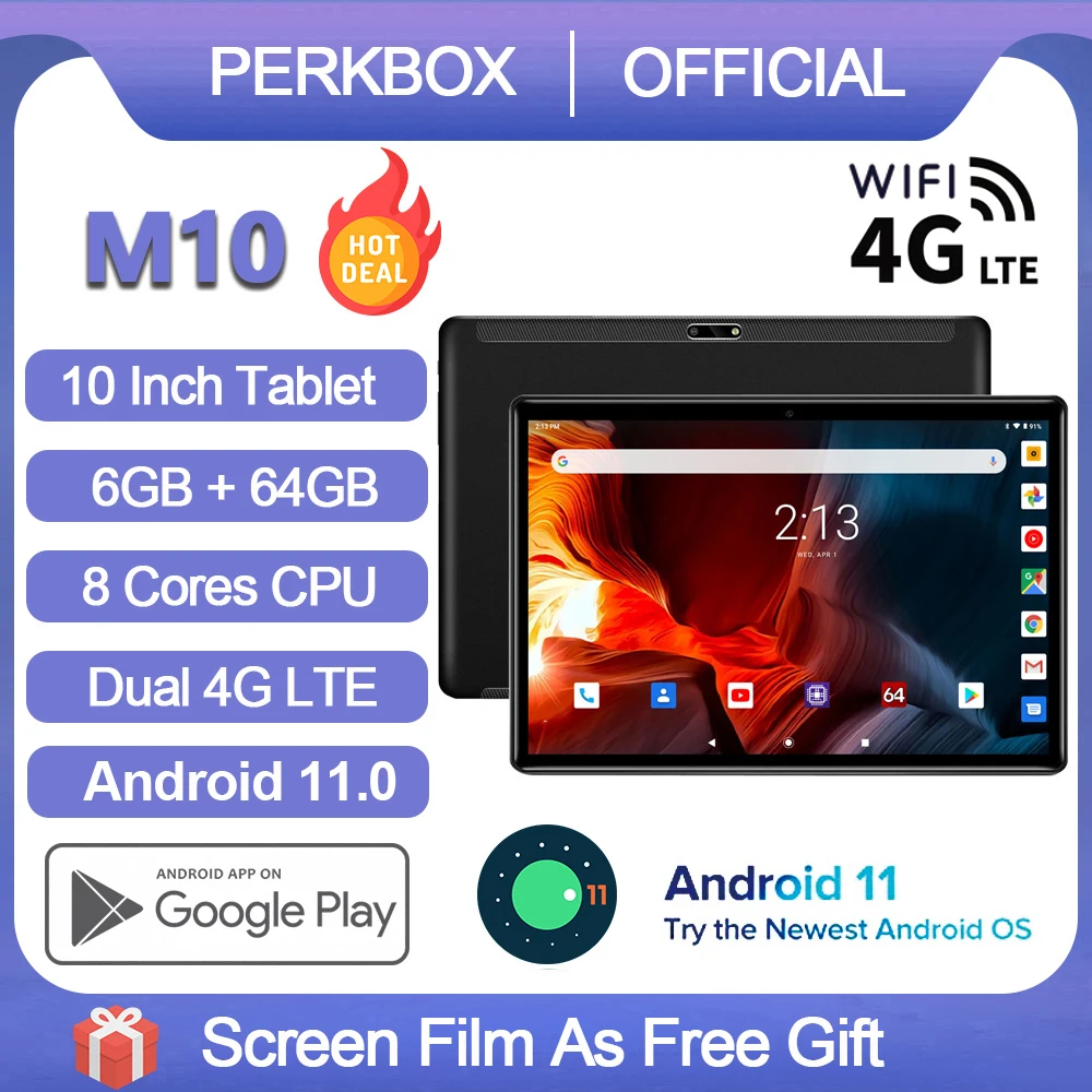 Планшет Perkbox, Android 11,0, 10-дюймовый экран, ультрапортативный, 4G LTE, 6 ГБ ОЗУ, 64 Гб ПЗУ, Wi-Fi, Восьмиядерный, GPS Pad