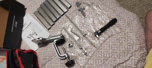 Стоимость покупки с купоном AliExpress 1040₽, с точилкой в комплекте 4 алмазных бруска (200, 500, 800, 2000). Точилка точит, но качество и продуманность точилки посредственная. Рекомендую сразу покупать новый шарнир с металическим шариком, в замен стандартного который сильно люфтит (фото 4). При повороте ножа угол заточки может не совпадать, необходимо регулировать. Комплектная сумка дешевого китая. Товар пришёл быстро и в целости.
