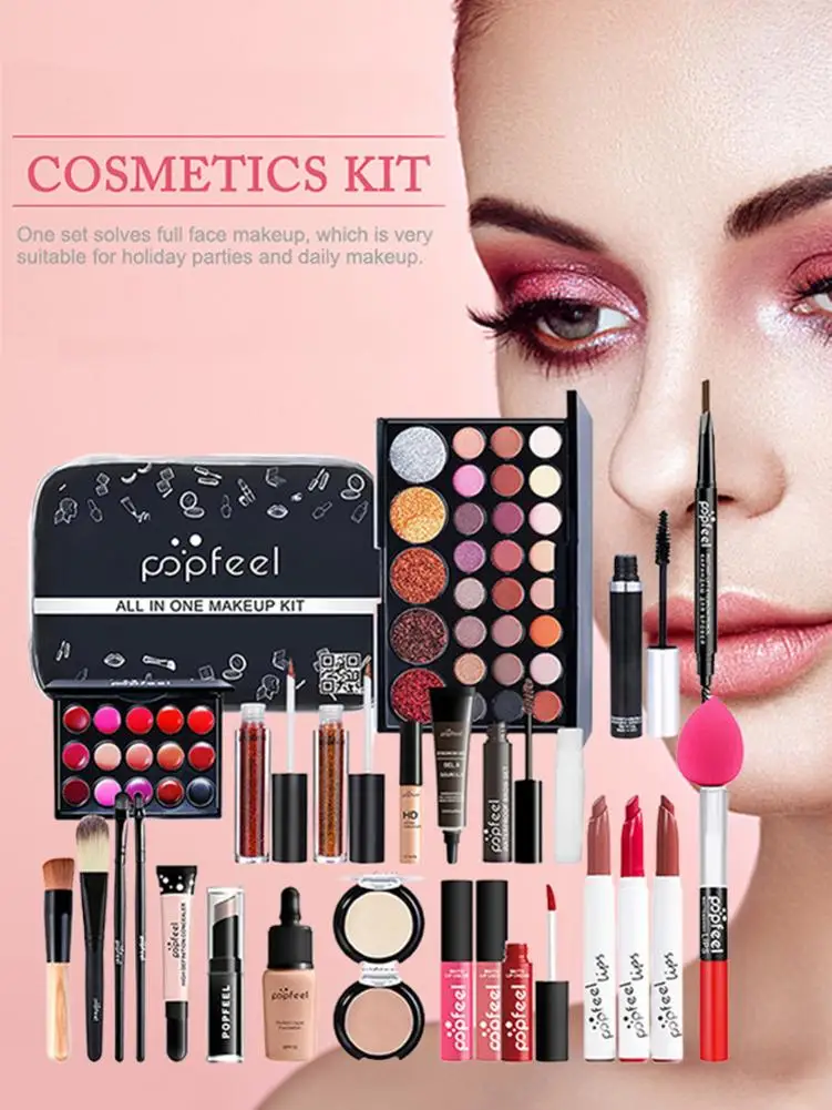 Упаковочный лист:(27 в 1)Косметическая кисть * 4Карандаш для бровей * 1Тушь * 1Блеск для губ * 3Тени для век * 1Помада * 15 цветовBB крем * 1Контурный Стик * 1Помада * 4 цветаКонсилер * 3Пудра * 1Бальзам для губ * 1Цветной пигмент для глаз * 2Основа для макияжа * 1Крем для бровей * 1