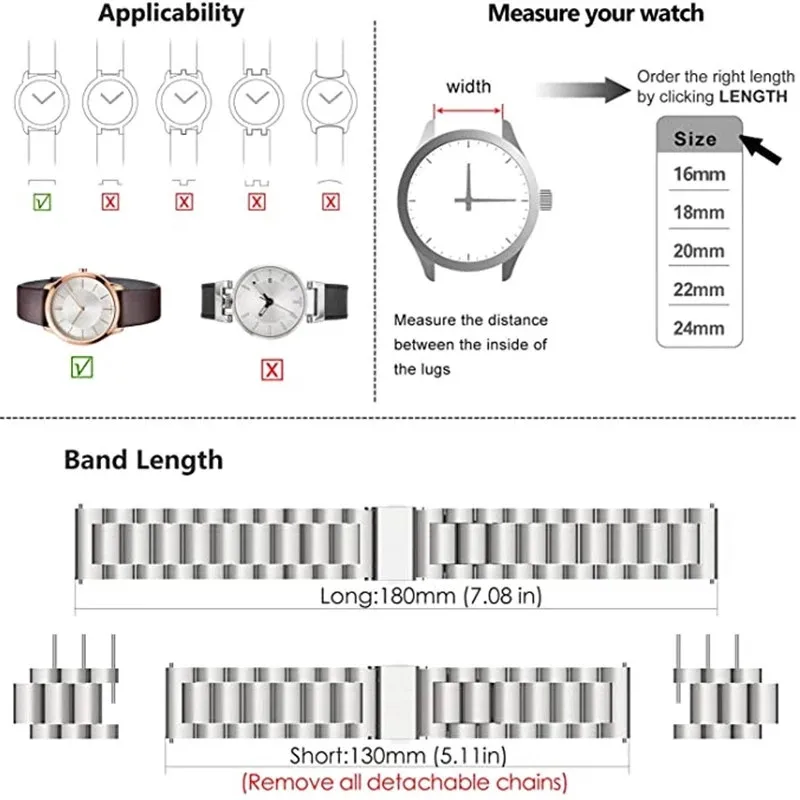 Посылка включает в себя:1X браслет из нержавеющей стали2X быстроразъемные булавки(Устройство для удаления лент, вы должны добавить в корзину и купить в пачке)