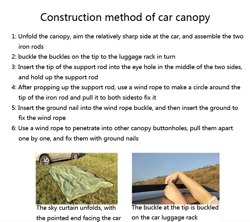 Характеристики:Название продукта: Автомобильный боковой тент на крыше тент водонепроницаемый боковой тент для кемпинга на открытом воздухеМатериал: 210D ткань ОксфордЦвет: армейский зеленый, хаки, темно-серыйРазмер: 300х15 0 см/118,11 "× 59,06"300х20 0 см/118,11 "× 78,74"440x20 0 см/173,23 "x 78,74"300x15 0/300x200cmBlueandBlack (нажмите на прыжок)Особенности:-Высокое качество: дождь, град или блеск вы не можете побить Премиум боковой тент! Установите в течение нескольких секунд для укрытия от пакетов так же быстро, чтобы вы были готовы ударить по трекам первой вещи утром.-Прочный: используются качественные компоненты, такие как анодированные стойки из сплава против царапин, костяшки из сплава и полиэфир Рипстоп для долгой жизни.-Фиксированная Пряжка, удобная и практичная.-Изысканный дизайн, красивый и практичный.Посылка включает в себя:1 х Автомобильный тент2 х железный стержень2x8 м веревки3x4 м веревки8 гвоздейПримечание:1. Замеры сделаны вручную, поэтому возможны 0,5-1 дюйм разницы в связи с тем, что измерения выполнены вручную. (1 дюйм = 2,54 см)2. Цвет фактического товара может немного отличаться от изображения из-за различий в экране компьютера, спасибо за понимание.