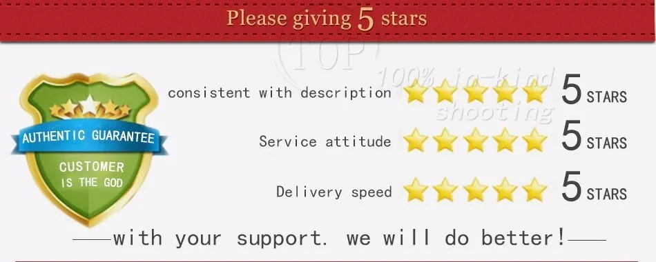 3. Если вы не удовлетворены товарами, пожалуйста, не стесняйтесь связаться с нами вовремя, и отправьте сообщение, прежде чем оставить отрицательный отзывы или открыть любой спор на alibaba. Мы всегда сделаем все возможное, чтобы решить проблему и удовлетворить ваши потребности.