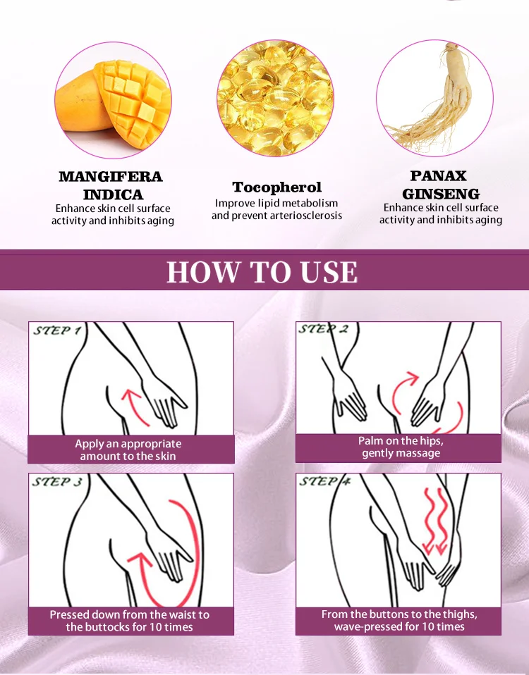 1. Нанесите необходимое количество продукта на ягодицы и массируйте круги сверху вниз.2. Будьте осторожны, чтобы не натирать бедра, промежность или обе стороны ягодиц.3. Используйте два раза в день, когда кожа будет теплой после душа или ванны.