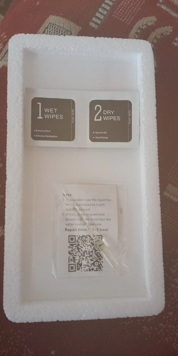 Да, есть 2 салфетки и жидкость, единственное нет стикеров от пыли