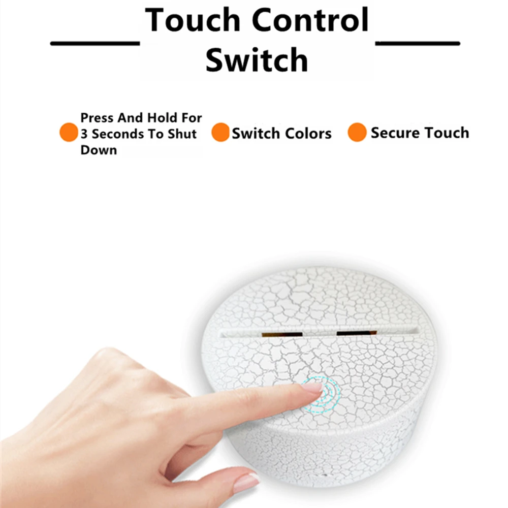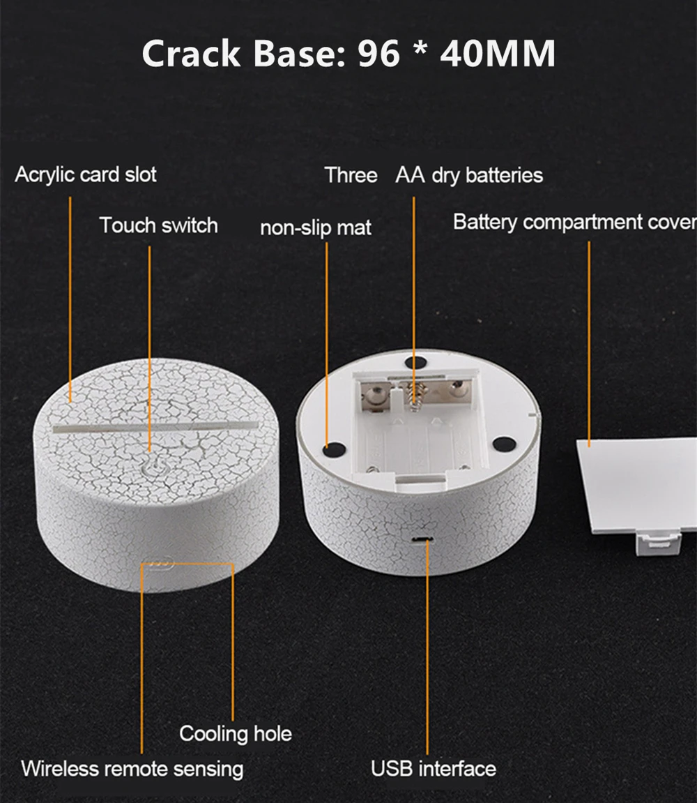Название продукта: 3D ночник/настольная лампаМощность продукта: 3 ВтНапряжение продукта: 5 ВВес продукта: 0,26 кгМатериал: акрил (светопроводная пластина) + АБС (основа)Толщина акриловой пластины: 3,5 ммРежим переключения: сенсорный выключатель, сенсорный + пульт дистанционного управленияБазовый размер: 96*40Размер цветной коробки: 205*145*55 ммКоличество в упаковке: 50 шт./ЧехолВес упаковки: около 13 кг