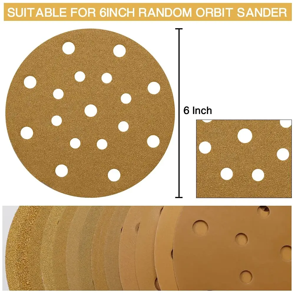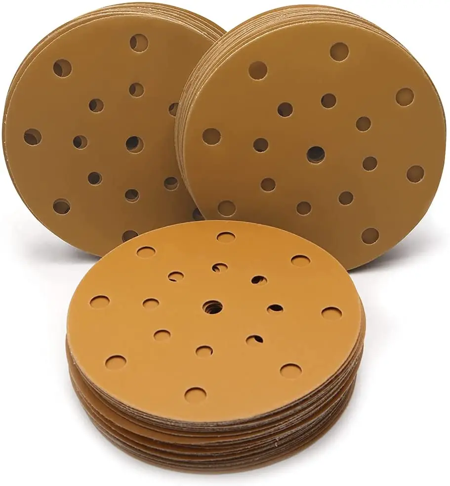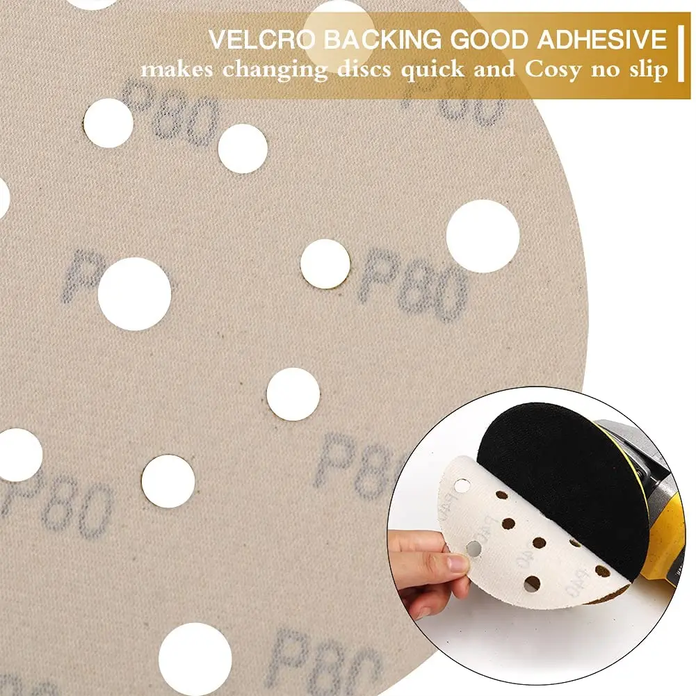 Предварительно пробитый с 17 отверстиями для эффективного извлечения пыли. Он может быть однородным-Высокоточный шлифовальный, исключительное Золотое стеаратовое покрытие с противозасоряющими и не загружаемыми свойствами, а также шлифовальный абразив, который является влагостойким и термостойким. Конструкция Velcro для более быстрой и легкой установки и удаления наждачной бумаги, также не отпадет при установке в использовании.