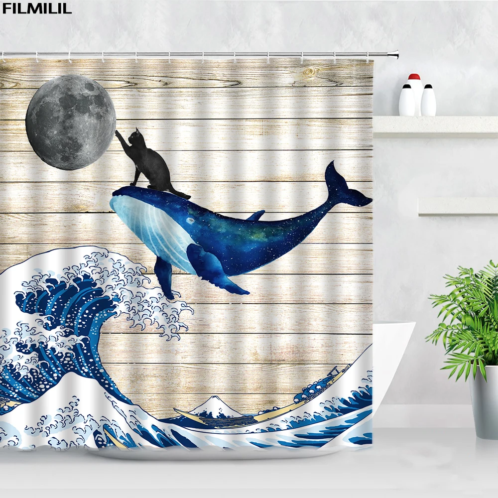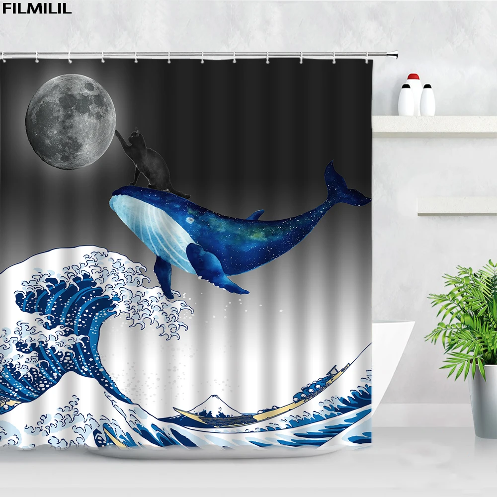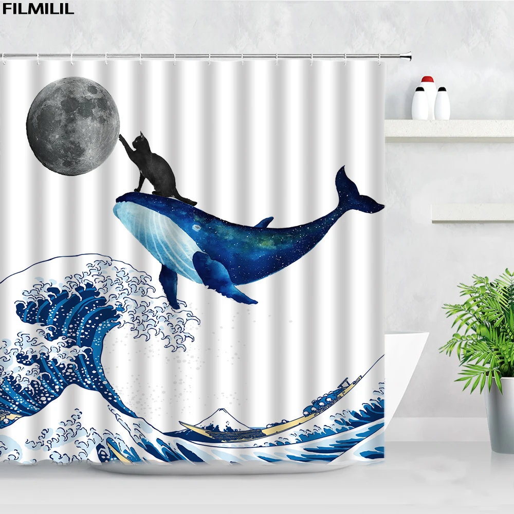 Забавная занавеска для душа с изображением черного кота, синего Кита, крепление s Moon Sea Wave Fuji, креативный художественный тканевый Декор для ванной комнаты, занавеска для ванной с крючками