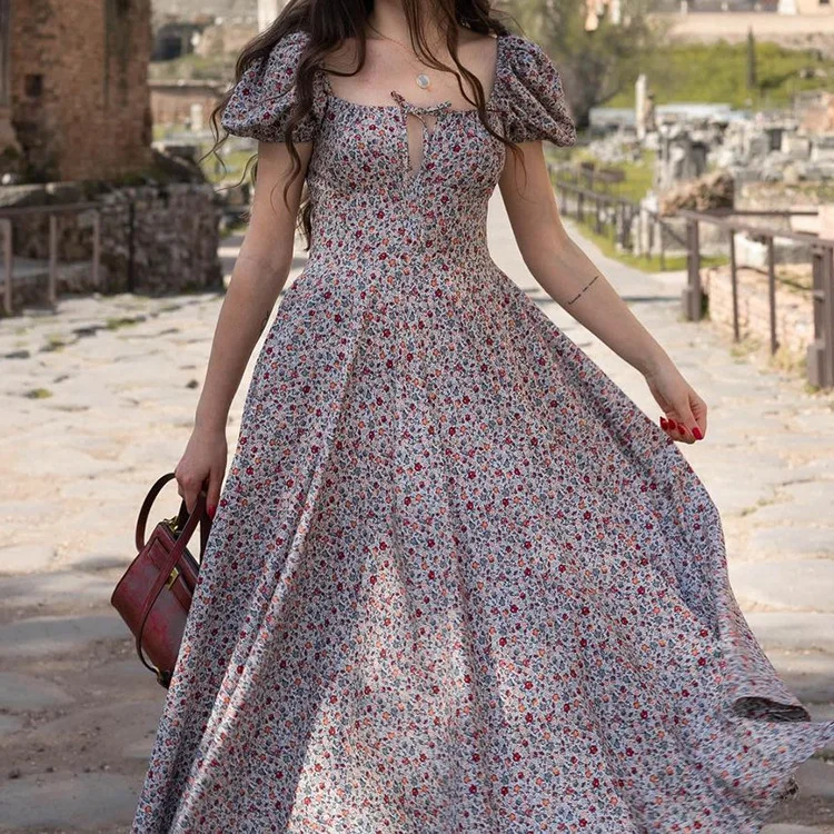 Женское летнее платье макси с коротким рукавом-фонариком, оборками ...
