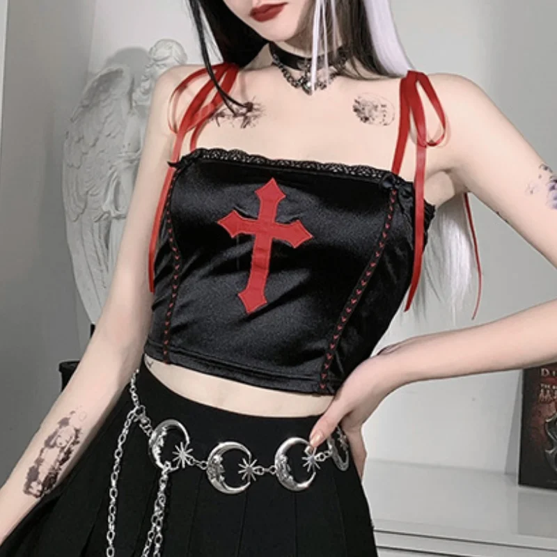Modegal Для женщин клетку; Рисунок героев мультфильмов; С кружевной отделкой галстук-бабочка плечевой ремень с вырезом лодочка камзол в готическом стиле, уличная гранж Harajuku укороченный топ