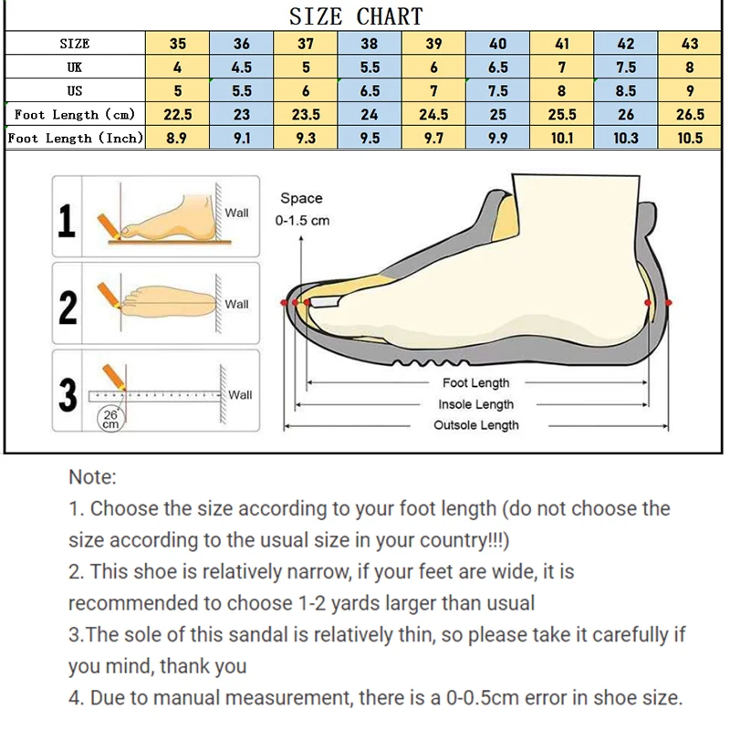 Примечание:1. Выберите размер в соответствии с длиной Вашей стопы (Не выбирайте размер в соответствии с обычным размером в вашей стране!)2. Эта обувь относительно узкая, рекомендуется выбирать на 1-2 размера больше, чем обычно3. Подошва этих сандалий относительно тонкая, поэтому, пожалуйста, будьте внимательны, если вы возражаете, спасибо4. Ввиду того, что Замеры производились вручную, есть 0-0,5 см; Она вполне допустима при в размерной таблице.5. Если у вас есть какие-либо вопросы, пожалуйста, сначала свяжитесь с нашей службой поддержки клиентов, и мы поможем вам решить их.