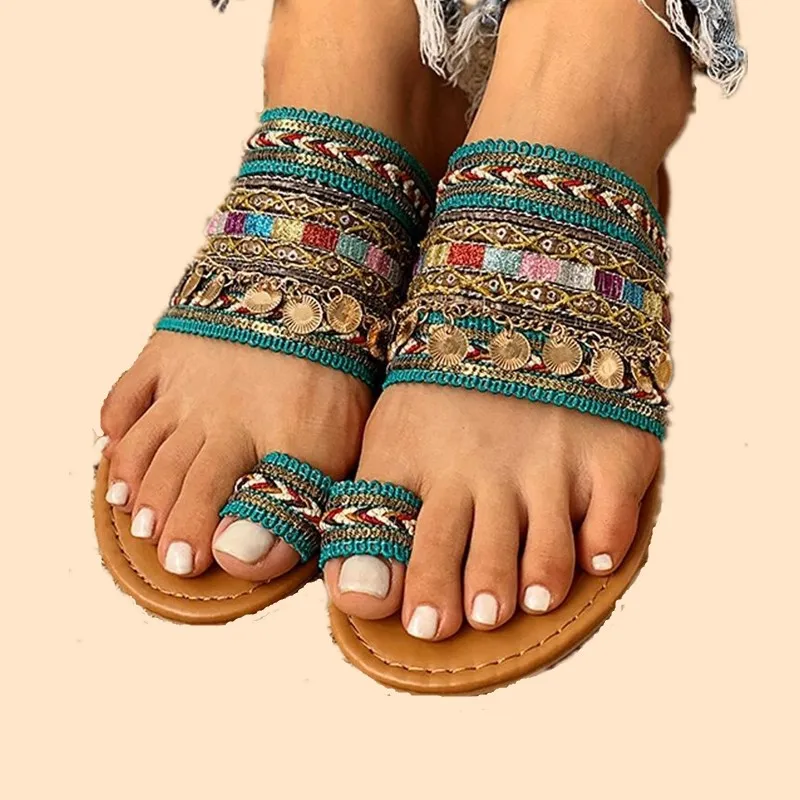 Летние женские сандалии; Повседневные женские шлепанцы на плоской подошве в народном стиле; Легкие пляжные шлепанцы в стиле бохо; Модные женские вьетнамки