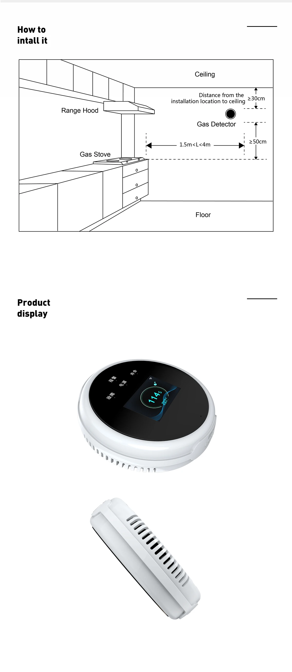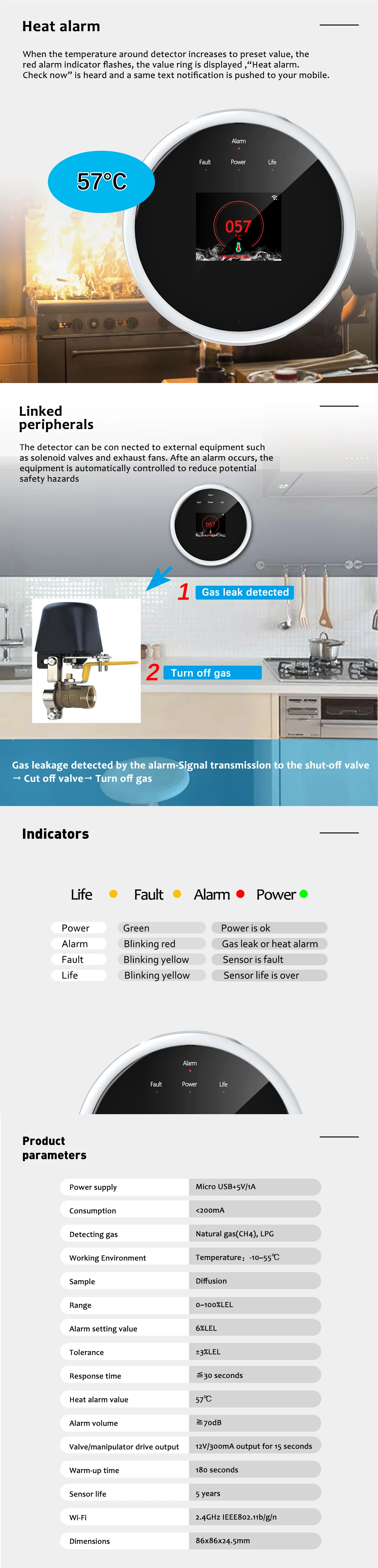 Детектор может быть установлен с внешним оборудованием, таким как СОЛЕНОИДНЫЕ клапаны и вытяжные вентиляторы. После возникновения сигнала тревоги оборудование автоматически контролируется для снижения потенциальных угроз безопасностиКогда температура вокруг детектора повышается до заданной величины, мигает красный индикатор тревоги, на дисплее отображается кольцо значений «тепловой сигнал.Проверьте сейчас "слышно и одно и то же текстовое уведомление выдвигается на ваш мобильный телефон.Спецификация:Источник питания: Micro USB + 5 В/1 АПотребление:<200 мАОбнаружение газа: природный газ (CH4), СНГРабочая среда: температура:-10 ~ 55 ℃Образец: ДиффузияДиапазон: 0-100% НельЗначение настройки сигнала тревоги: 6% НельДопуск: ± 3% НельВремя отклика: ≤ 30 секундЗначение тепловой сигнализации: 57 ℃Громкость будильника: ≥ 70 дБВыход привода клапана/манипулятора: выход мА в течение 15 секундВремя разогрева: 180 секундыСрок службы датчика: 5 летWi-Fi: 2,4 ГГц IEEE802.11b/g/nРазмеры: 86x86x24,5 ммВилка: Великобритания